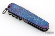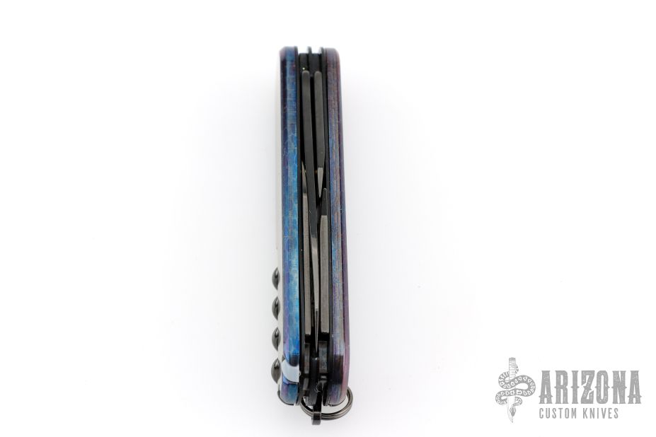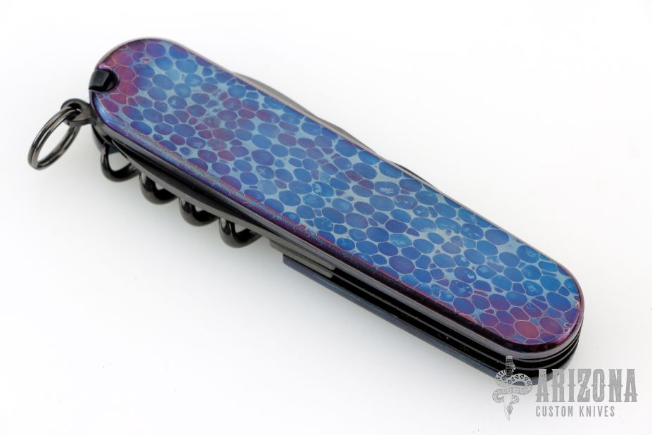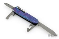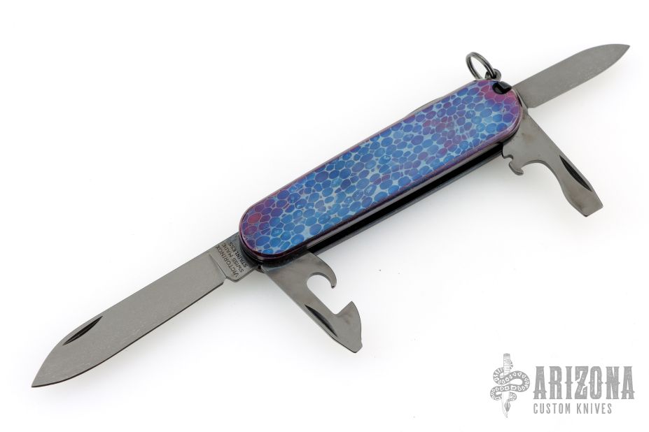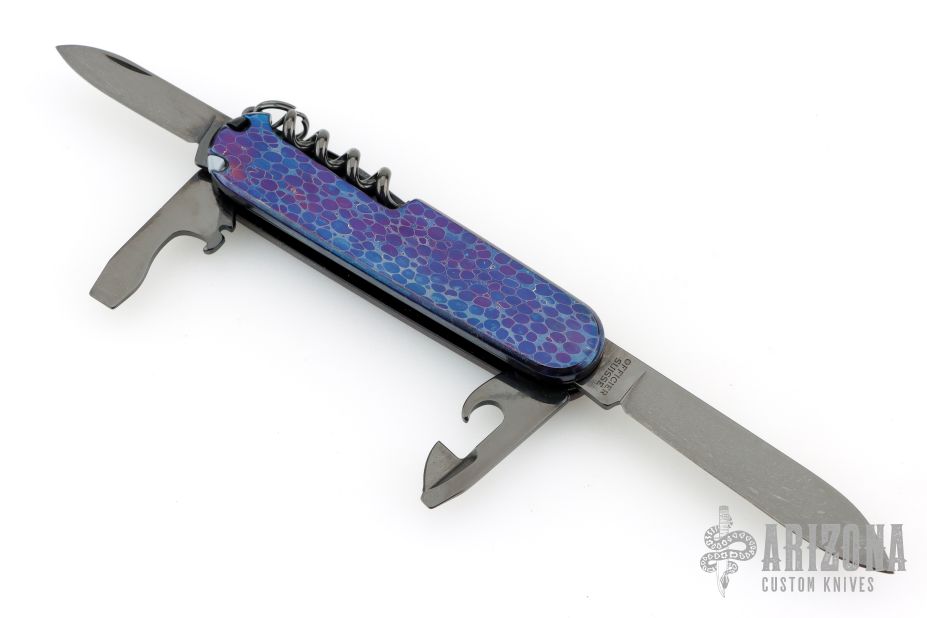 This knife by Victorinox has been customized and features two DLC blades, tools and scissors.  The handle features anodized Damascus scales over DLC steel liners/backsprings.  Includes pen in tweezer slot, and a tooth pick. Excellent condition.