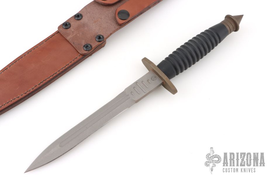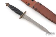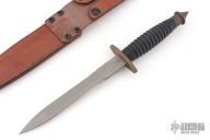 This V42 Dagger by Mick Strider features a double edged bead blasted blade with fullers, .206" blade stock and .880" blade depth, hidden tang construction. The handle has an anodized and tumbled titanium guard and butt with black aluminum grip. Comes with a brown leather sheath by Chattanooga Leatherworks. New condition.