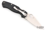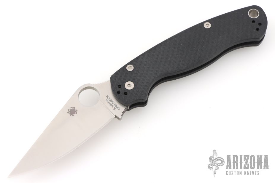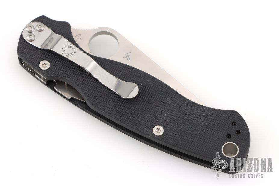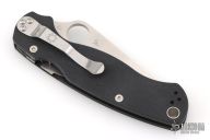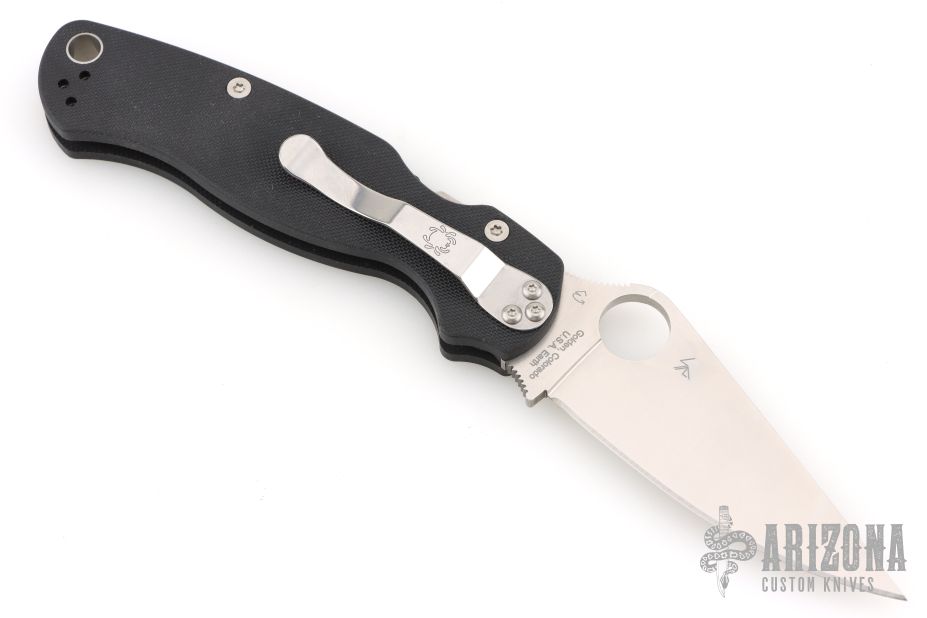 This Paramilitary 2 Linerlock Folder from Spyderco has a satin finished clip point blade with thumb hole and notched thumb rest. Handle is black G10 with stainless steel liners and stainless steel 4-way reversible clip. New condition. Comes with original box and papers.