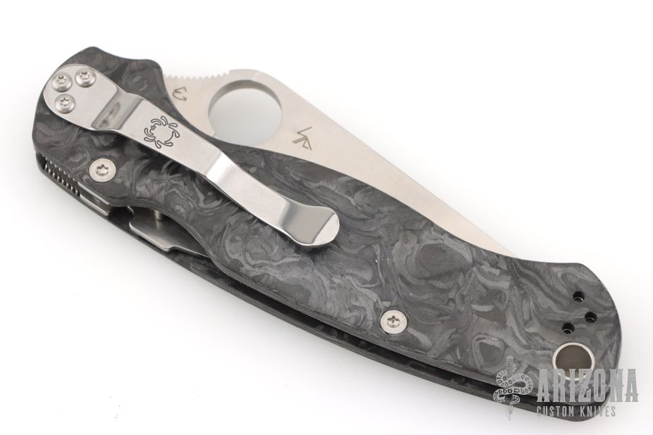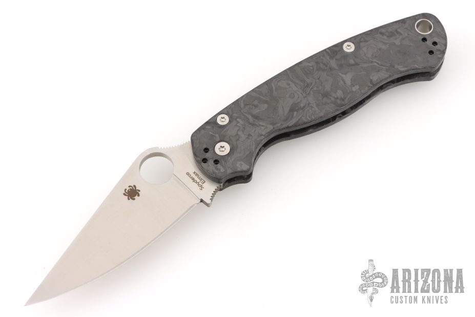 This Paramilitary 2 Linerlock Folder has a satin Elmax clip point blade with thumb hole and notched thumb rest. Handle is carbon fiber with stainless steel liners and stainless steel 4-way reversible clip. Comes with original box and papers. New condition.  One of 800 made.