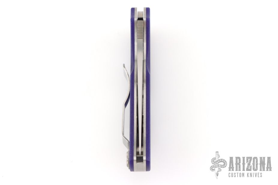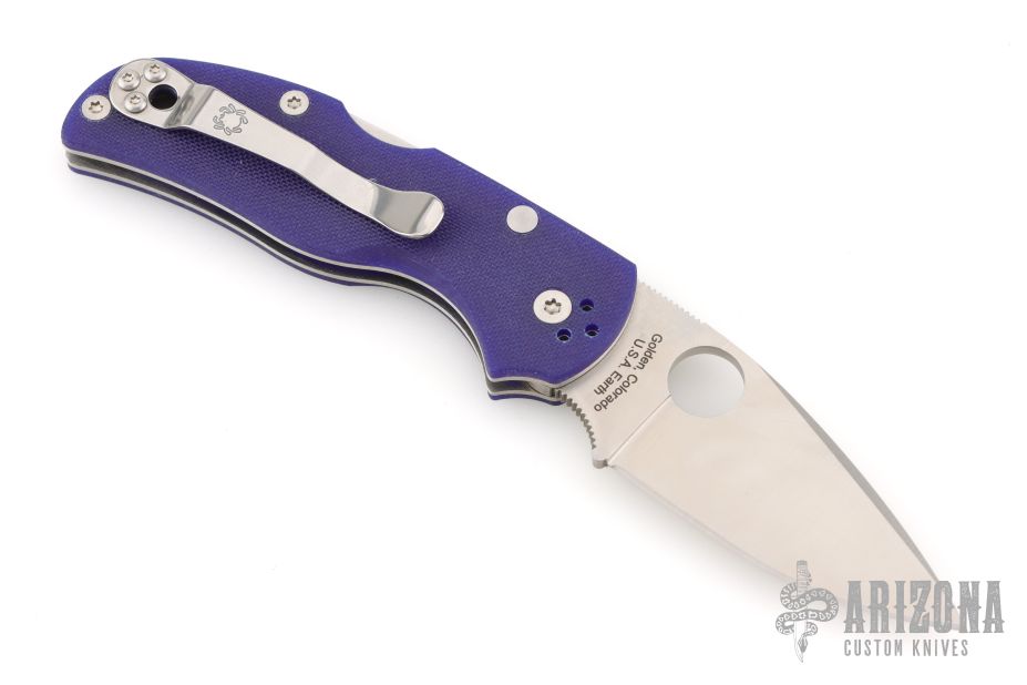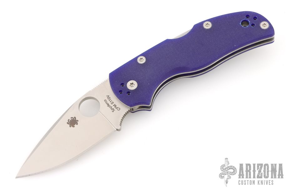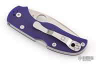 This Native5 folder by Spyderco Knives has a satin finish blade with thumbhole. The handle has purple G-10 scales, stainless steel liners, and a 4-way reversible stainless steel clip. Nice smooth action. Comes with original box and papers. New condition.