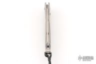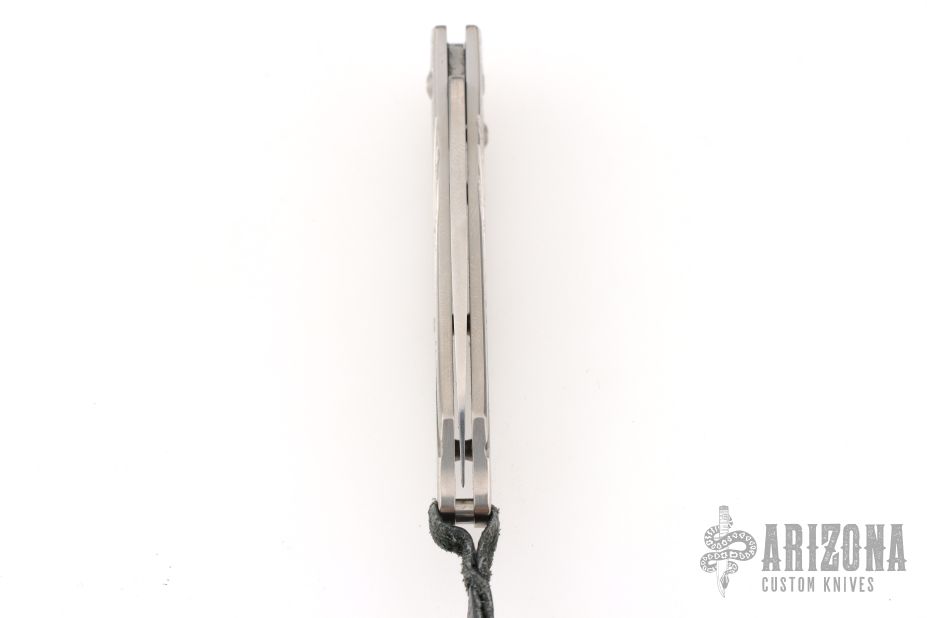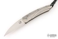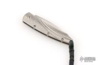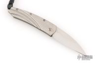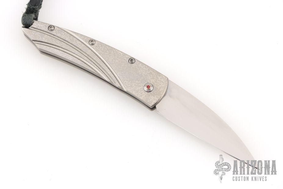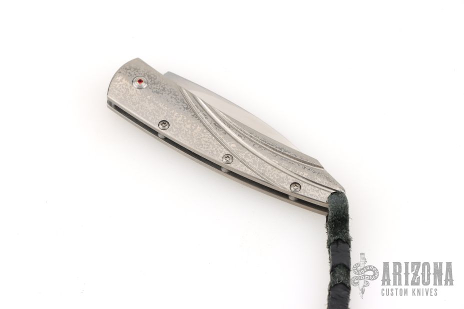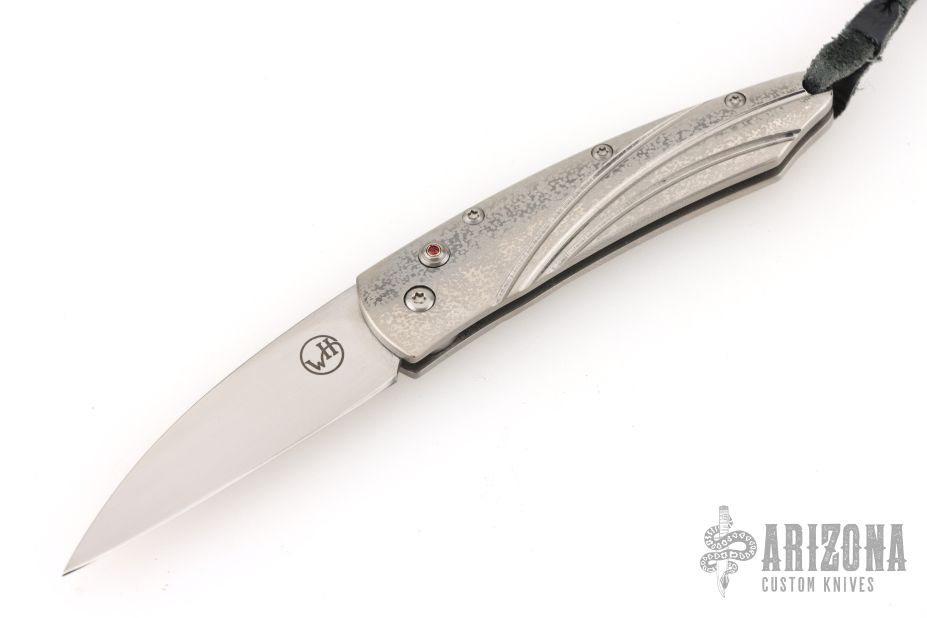 This side opening auto by William Henry Fine Knives features a hand rub satin finished blade. The handle has a stippled titanium frame with push button, push button and pivot have a sapphire stone set in a gold bezel. Fast action and strong lock up. Excellent condition.