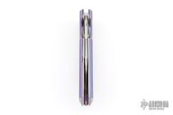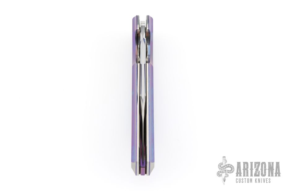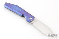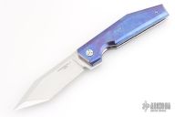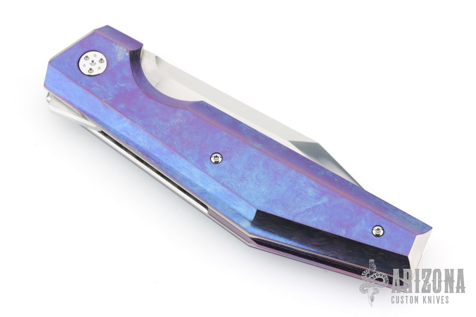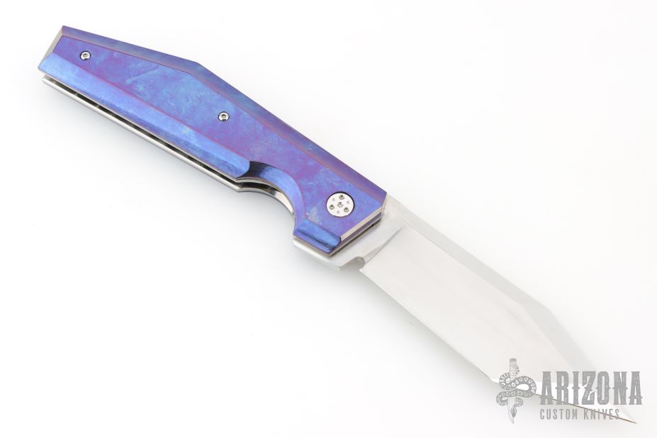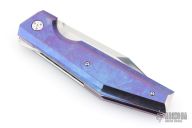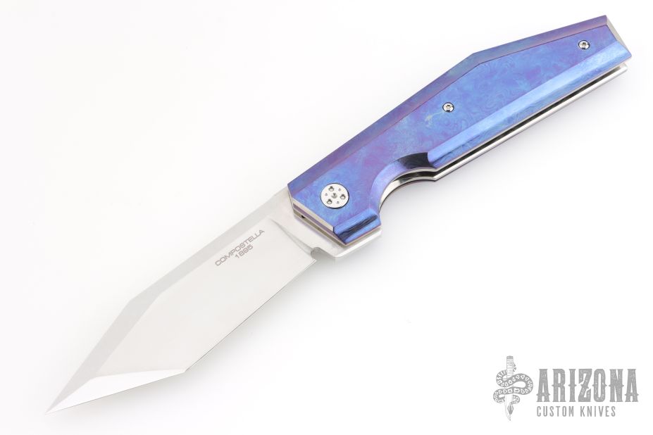 This lockback by Stefano Compostella features a hand rub satin finished Erasteel Apz10 60 HRC blade with swedge and flipper tab. The handle timascus covers, with frame with polished titanium liners, and matching timascus backstrap. Comes with a zipper case, cloth, and leather slip sheath with clip. Excellent condition.