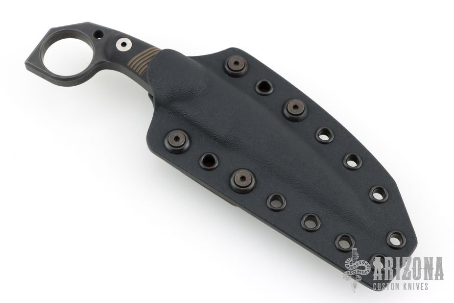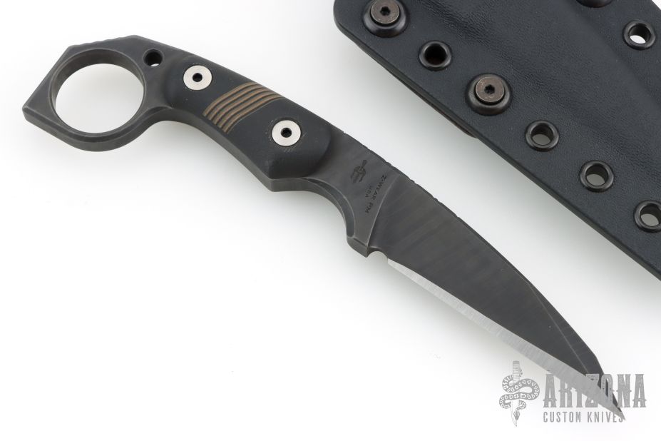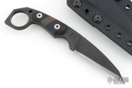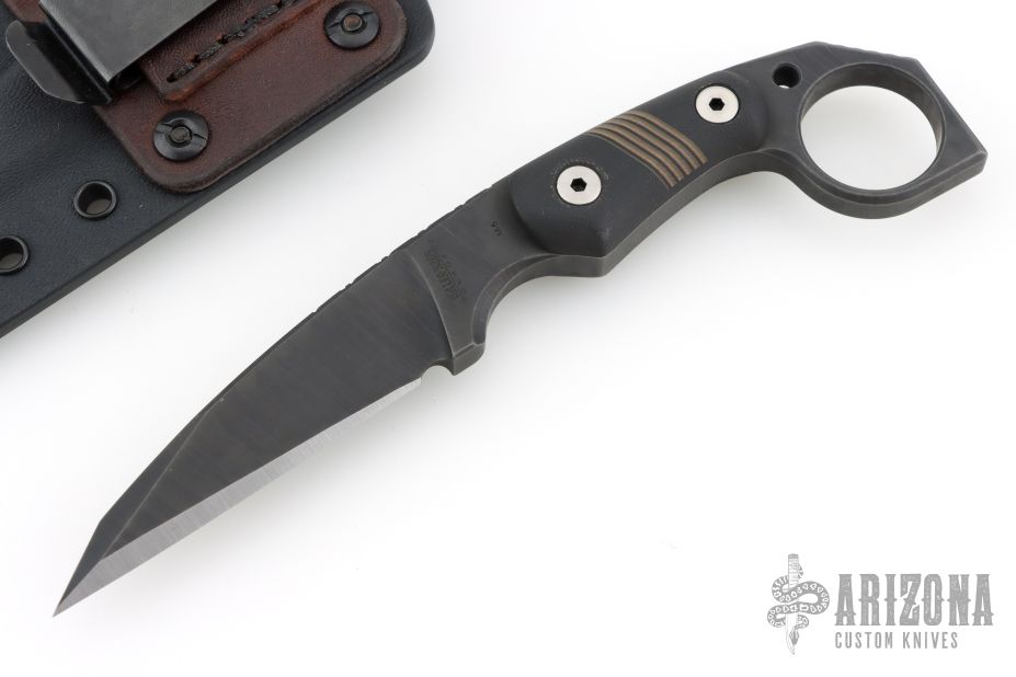 This M-5 Karambit from Miller Bros Blades features a coated wharncliffe blade with notched thumbrest, .323" blade stock and .964" blade depth, full tang construction. The handle has black G-10 scales with inlaid stripes. Includes a kydex sheath with belt clip. New from maker.