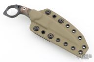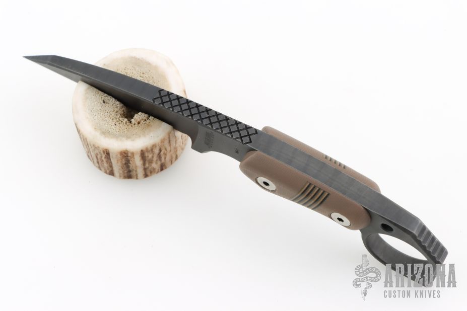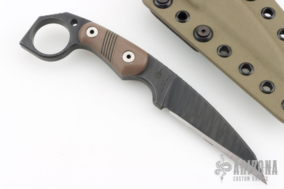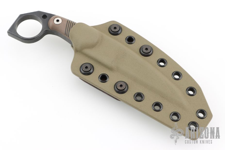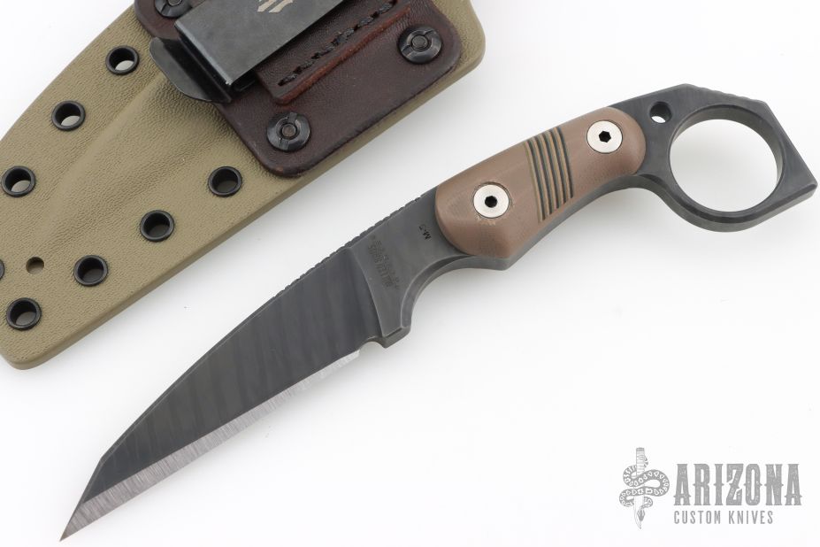 This M-5 Karambit from Miller Bros Blades features a coated wharncliffe blade with notched thumbrest, .323" blade stock and .964" blade depth, full tang construction. The handle has brown G-10 scales with inlaid stripes. Includes a kydex sheath with belt clip. New from maker.
