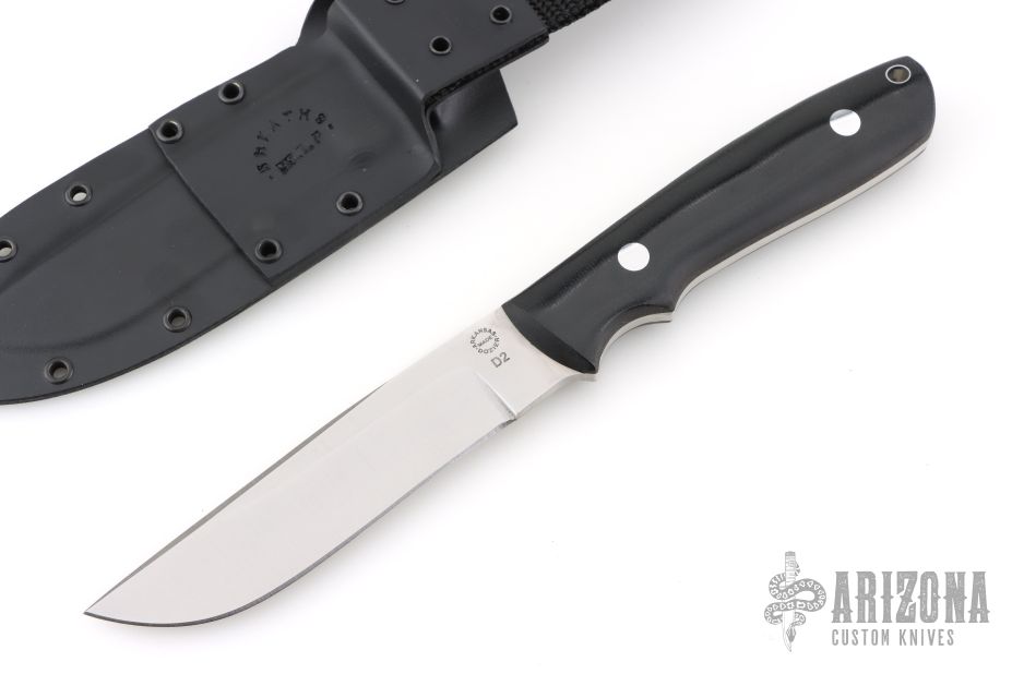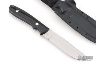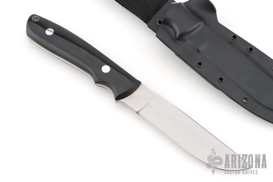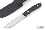 This KS-7 Wilderness by Dozier Knives has a satin finished blade with full tang construction, .174" blade stock, 1.064" depth, full tang construction. Handle has black canvas micarta scales, aluminum pins and lanyard tube pin. Comes with kydex sheath. New from maker.