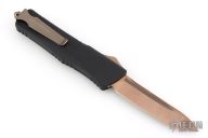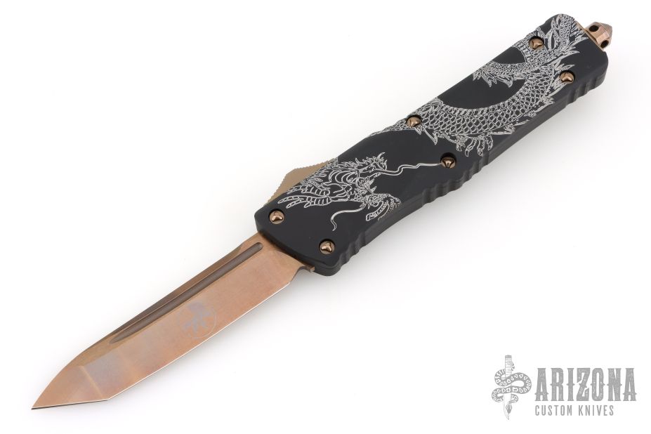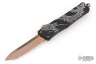 This Combat Troodon OTF automatic features a gold/satin finished T/E blade with a standard edge. Black aluminum handle with a tip down blasted stainless steel clip. Glass breaker. Laser engraved and Art by PVK Vegas. Comes in a max Velcro case. Has a couple light scuffs, excellent condition.