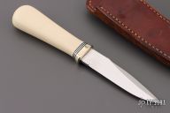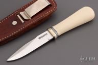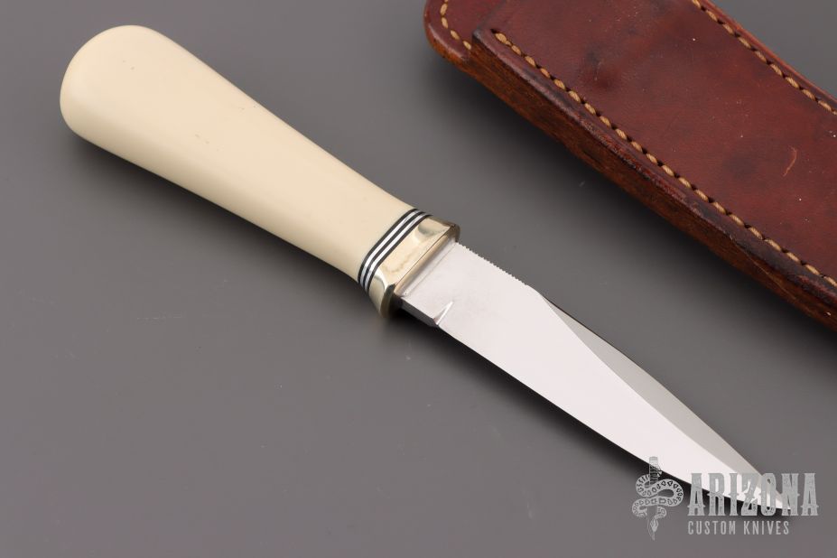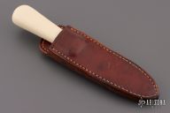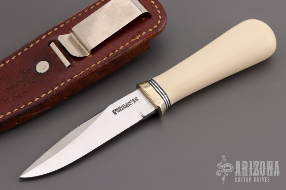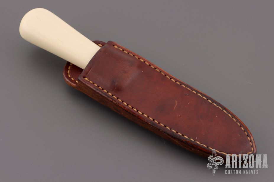This Gambler by Randall Made Knives features a satin finished blade with .154" blade stock and .883" blade depth, hidden tang construction. Sharpened top edge. Notched thumbrest. Ivory paper micarta grip with nickel silver guard, black/duralumin spacers. The Gambler is one of Randall's non-catalog knives. Brown leather sheath with boot clip. Comes with a Randall zippered case. Excellent condition.
