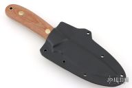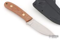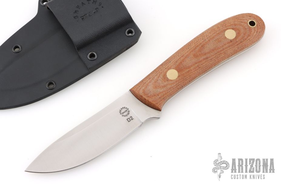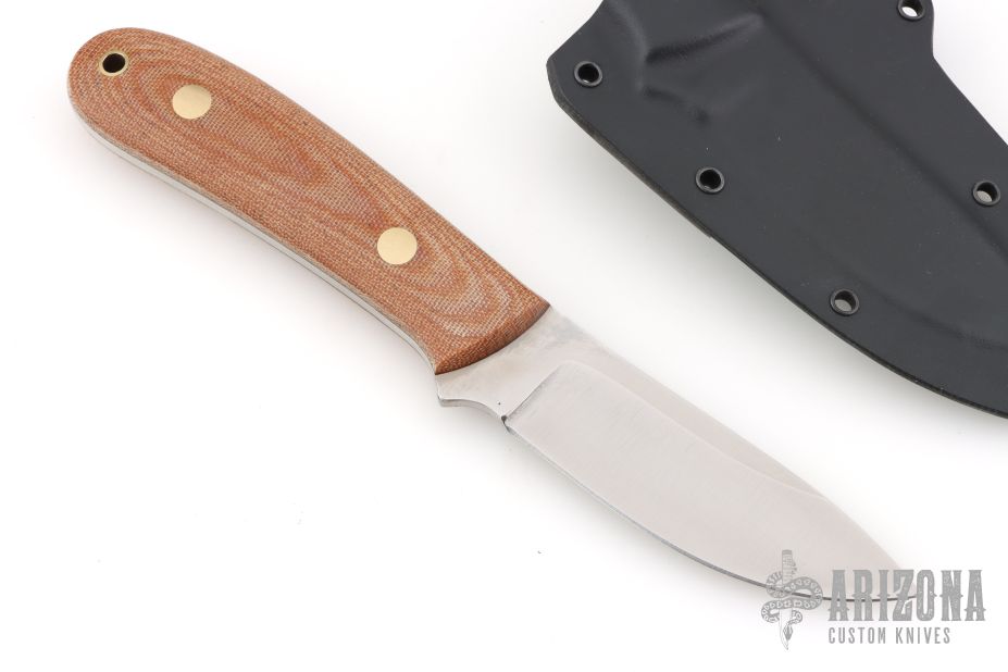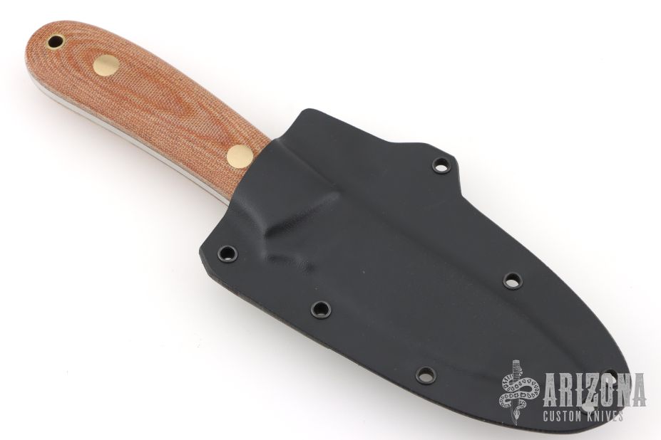 This K-5 King's River Skinner by Dozier Knives features a satin finished blade with .136" blade stock and 1.039" blade depth, full tang construction. The handle has natural canvas micarta scales with brass pins and lanyard hole. Comes with kydex sheath with belt clip. New from maker.