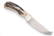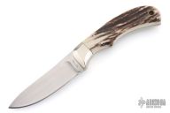 This knife by Martin Pullen features a hand rub satin finished blade with .128 blade stock and .896" blade depth, full tang construction. The handle has nickel silver bolsters, stag scales and lanyard hole in pommel. Comes with a zipper case. Has some light scratches, excellent condition.