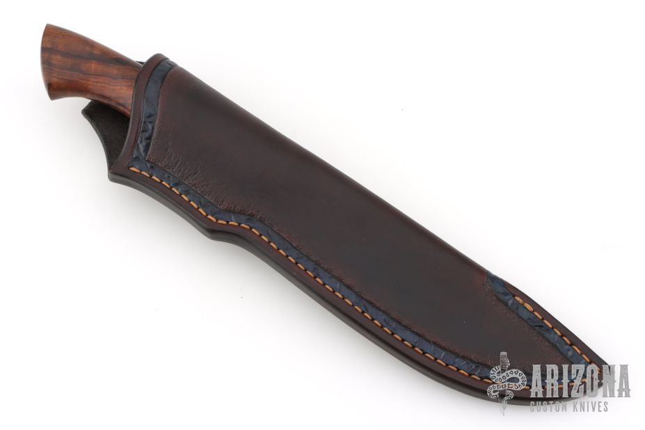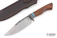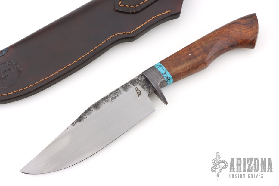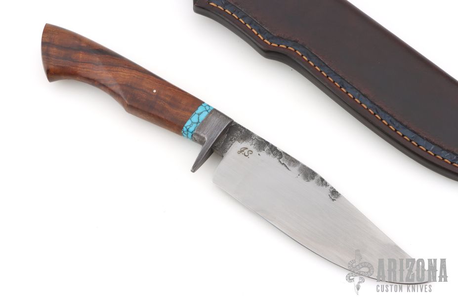 This Hunter by Ben Aiken features a hand rub satin finished blade with forge finished flats and ricasso (he calls this the Evolution Finish), .177" blade stock and 1.624" blade depth, hidden tang construction. The handle has an etched wrought iron guard, desert ironwood grip with a single nickel silver pin, turquoise spacer. Comes with a black/brown hand tooled leather sheath made by Cindy Akin. Comes with a COA and zippered case. New from maker at the 2026 Blade Show Texas.