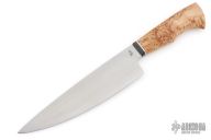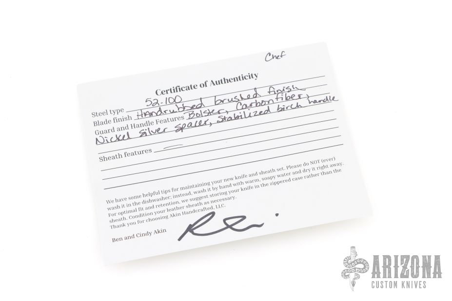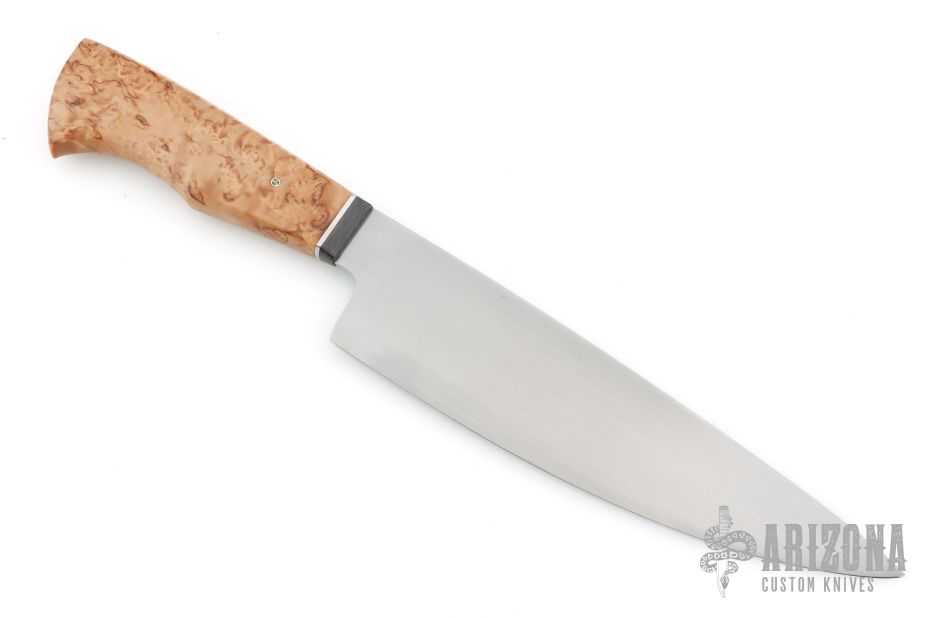 This Chef Knife by Ben Aiken features a hand rub satin finished blade with .159" blade stock and 1.905" blade depth, hidden tang construction. The handle has a carbon fiber bolster, nickel silver spacer, and a stabilized birch burl grip with a single mosaic pin. Comes with a COA and zippered case. New from maker at the 2026 Blade Show Texas.