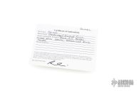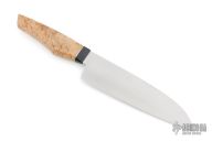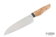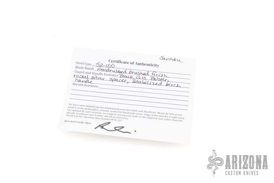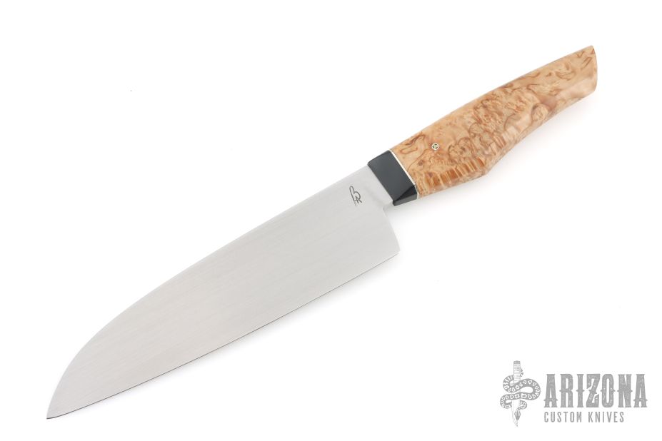 This Santoku by Ben Aiken features a hand rub satin finished blade with .149" blade stock and 1.740" blade depth, hidden tang construction. The handle has a black G-10 bolster, nickel silver spacer, and a stabilized birch burl grip with a single mosaic pin. Comes with a COA and zippered case. New from maker at the 2026 Blade Show Texas.