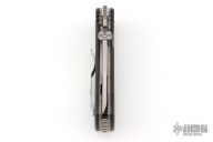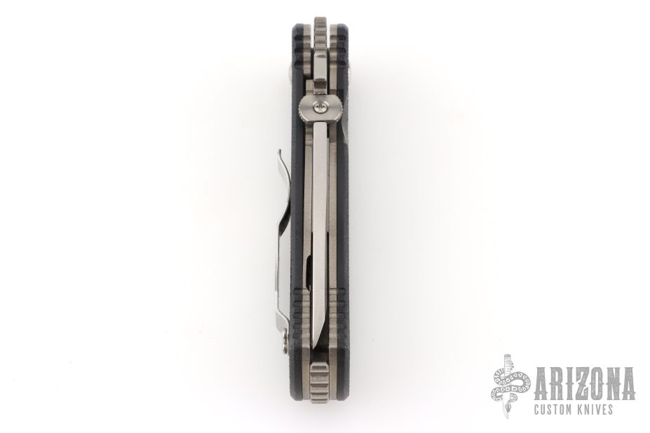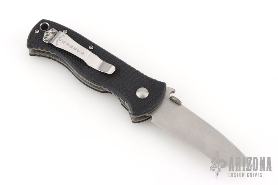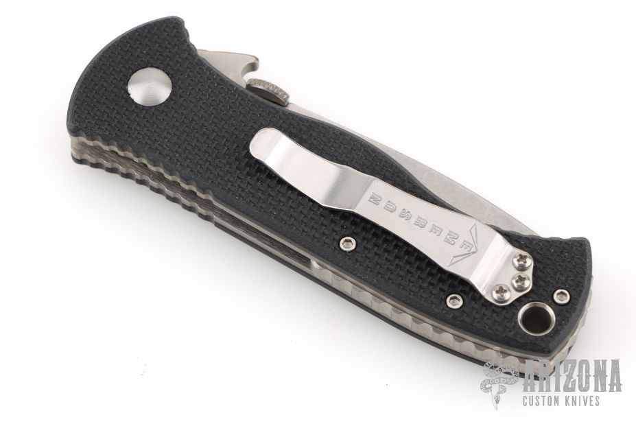 This knife by Emerson Knives features a satin and stonewashed chisel ground blade with thumbdisc, wave feature, notched thumbrest and flipper. The handle has textured black G-10 scales, tumbled titanium liners and notched backspacer, lanyard hole, tip up reversible stainless steel clip, stainless steel lockface insert. Rides on bearings, nice detent, lockup and blade seating. #0089 on blade and signed on the rear of the blade by Ernest Emerson. Comes with original box and papers. Excellent condition.
