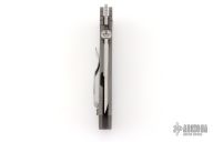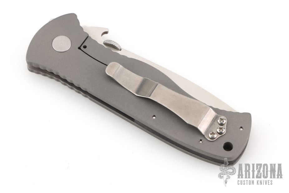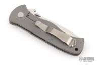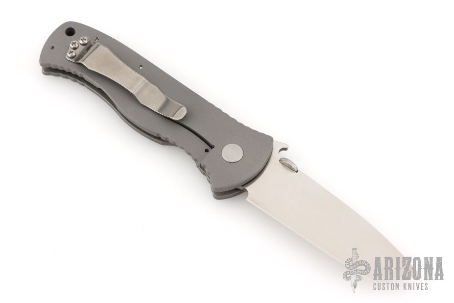This Custom HD-7 features a satin finished chisel ground tanto blade with a knurled thumb disc and wave.  The handle features a bead blasted titanium frame with a tumbled stainless tip up pocket clip.  Black G-10 Backspacer.  Includes the original box and papers.  Nice detent, lock up and blade seating. The pivot is tightened enough to affect the action - not easily opened/closed. Has a couple light scuffs. Excellent Condition.
