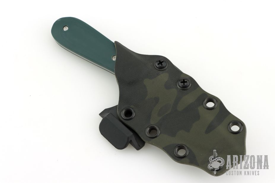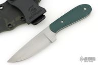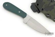 This EDC by Erik Fritz features a hand-rubbed satin blade with visible hamon and notched thumbrest, .120" blade thickness and 1.023" blade depth, full tang construction. Blades are triple quenched and triple tempered. The handle has hunter green G-10 scales. Very nice work. Comes in a Kydex sheath. New from maker at the 2026 Blade Show Texas.