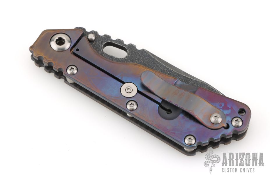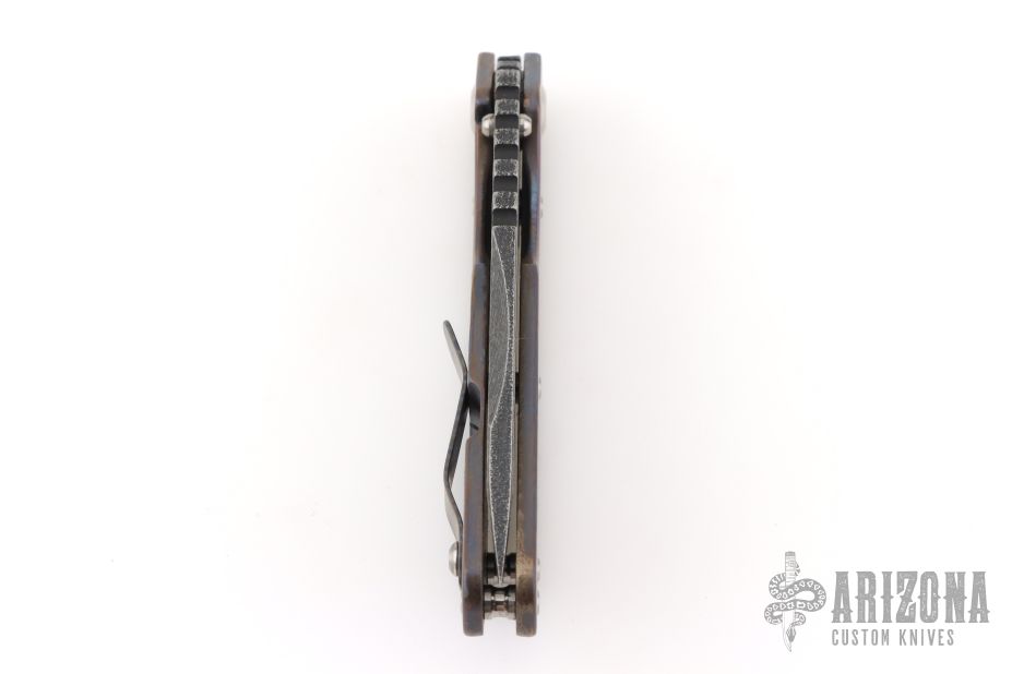 His knife line grew over the following years to include different varieties of fixed blades, all distinctive and many with specialized uses. But constant in all of them was a disregard for convention, and a desire to try new ideas. An example of this was the Ajax – it featured a very wide blade surface clearly designed to inflict damage. It drew on the weapons carried by Roman legionnaires, yet was modern and usable in the 21stCentury battlefield. Mick also worked on his technical skills, always striving to become better at the physical craft. At the 2002 Blade Show, a group of the best tactical knifemakers in the country decided to compete with each other to produce the most innovative and interesting fixed “battle blade” at the show. Mick’s entry, an incredible integral knife made out of ½” titanium stock with a zippered composite blade, gorgeous handles, and integral guard was the unanimous winner, and effectively retired the competition.