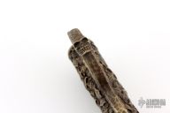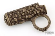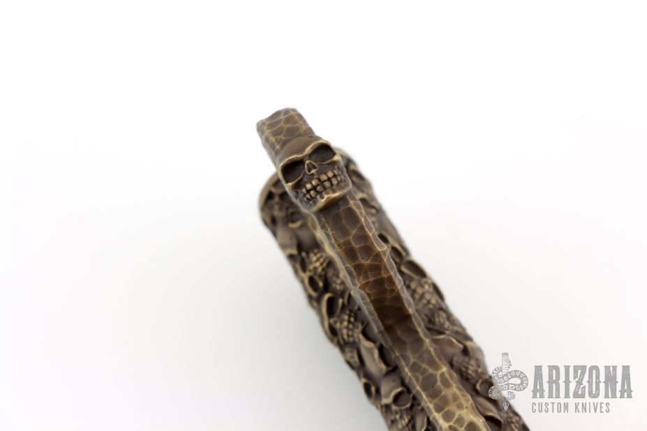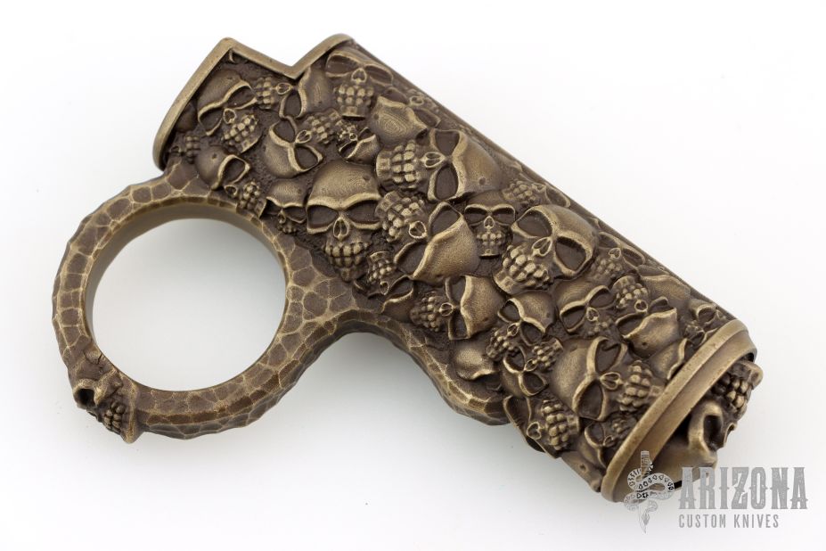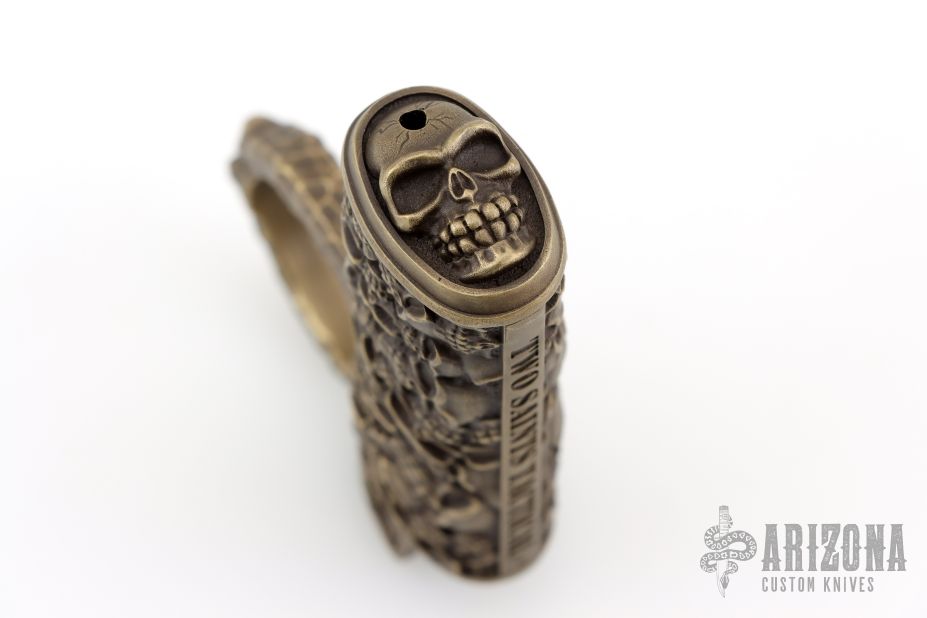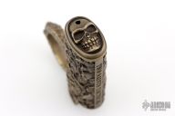 Manufactured in France by 2 Saints Tactical, this bronze Maxi Bic lighter case is absolutely incredible.  It includes what 2 Saints Tactical calls their "love ring" and a skull crusher/glass breaker on the butt-end. It features an awesome bronzed finish with Bastinelli's own Reaper Skulls all over the place. Lighter not included. Excellent condition.