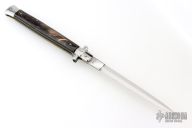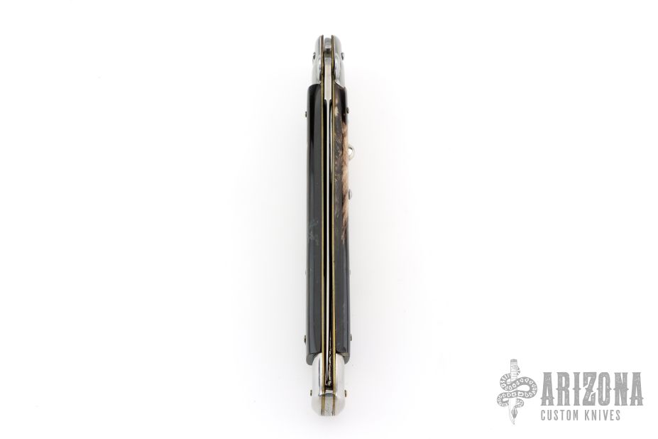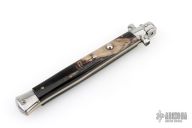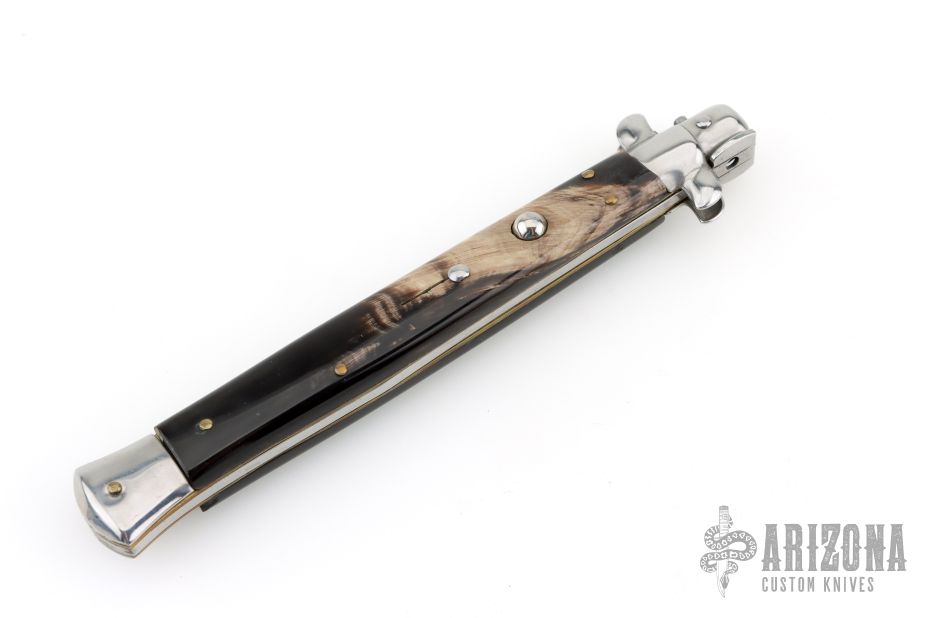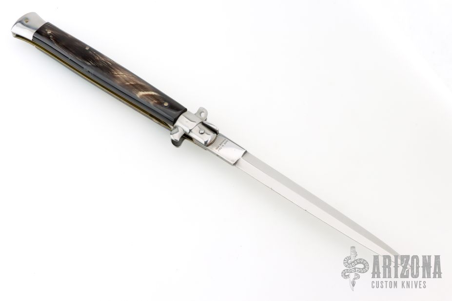 This 13" swivel bolster features a polished dagger ground blade. The handle has stainless steel bolsters, front and rear, horn scales, brass liners, stainless spring. Excellent condition.