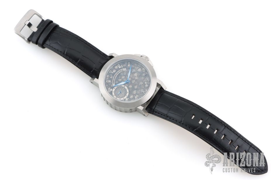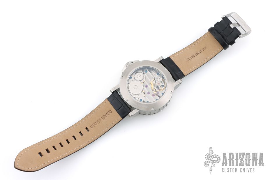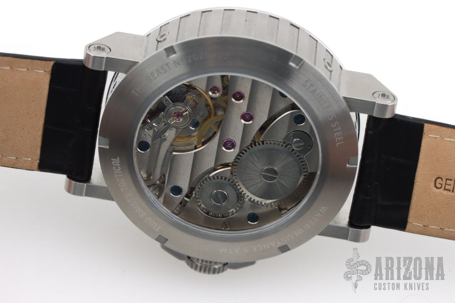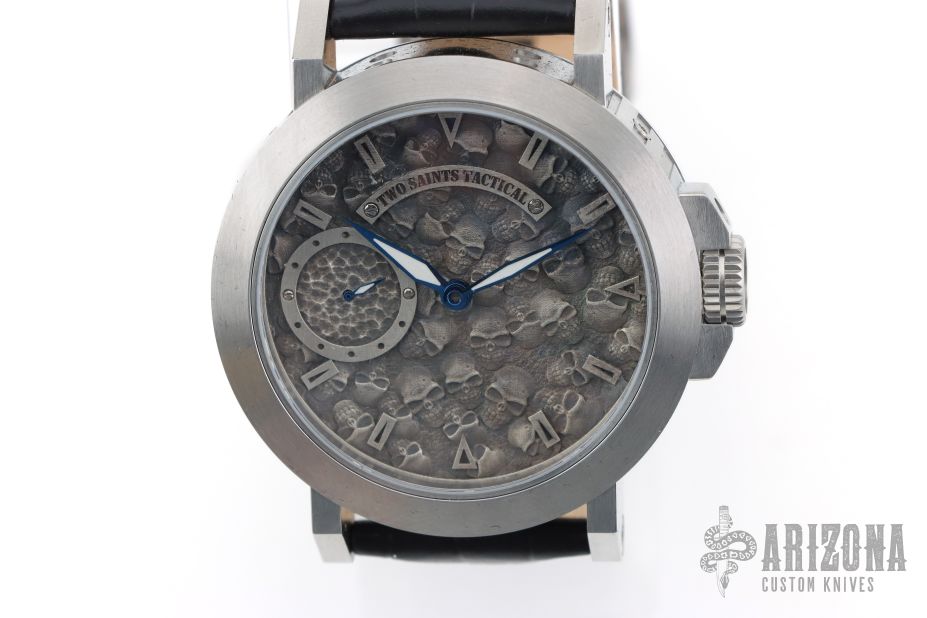 Two Saints Tactical Watch "The Beast" No 2025063. Has a 48mm stainless steel case, silver skull motif face with blue hands with white centers. Water resistance 5 ATM. Mechanical movement. Comes with original box. New from maker.