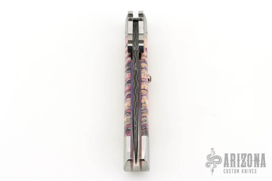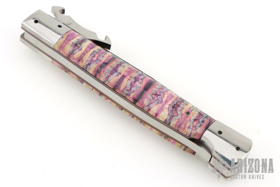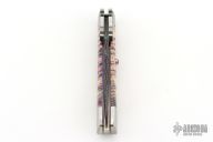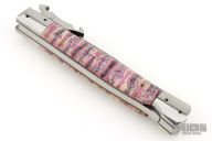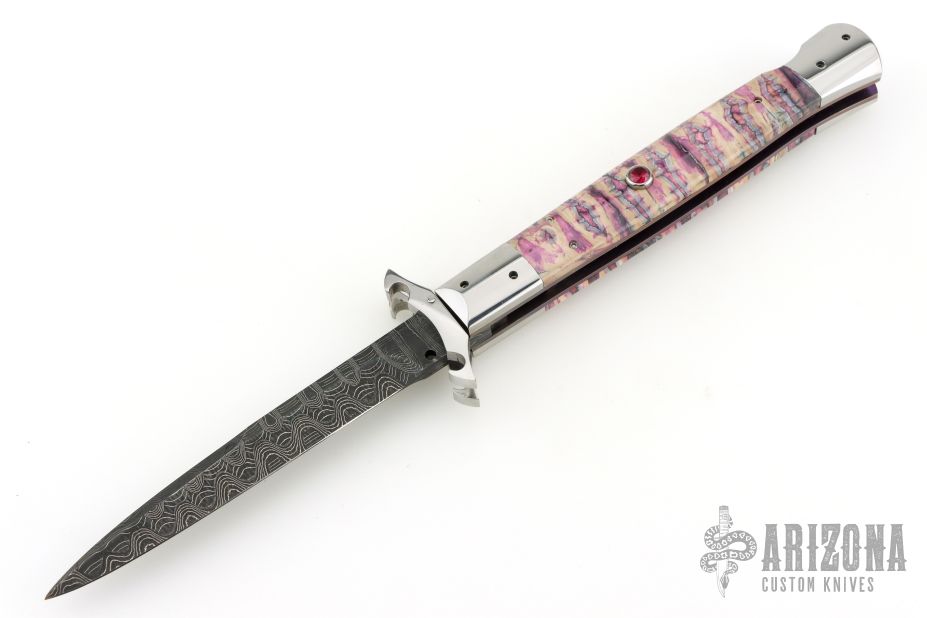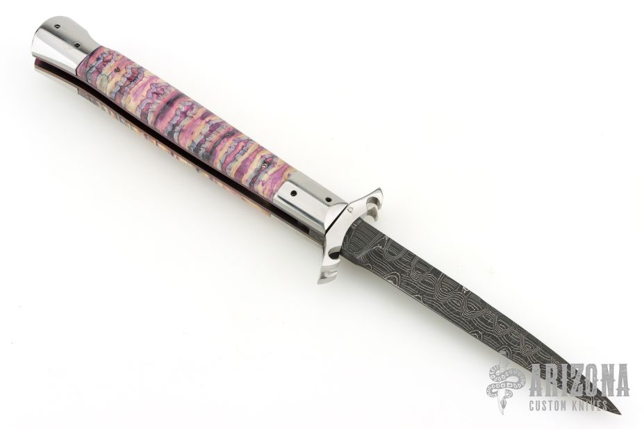 This swing-guard auto by Burn Knives features a Damascus bayonet ground blade with a false top edge. The handle has stainless bolsters and swing guard, pink mammoth ivory  scales, anodize titanium liners, and a stainless steel backspacer. Comes with gold jewelry box. Has some light scratches on the bolsters and release button, otherwise excellent condition.