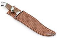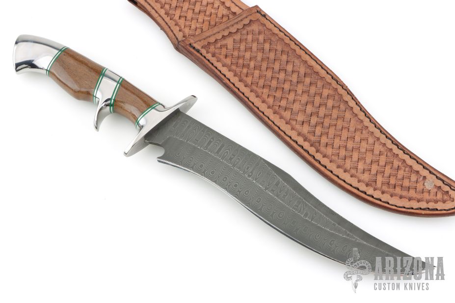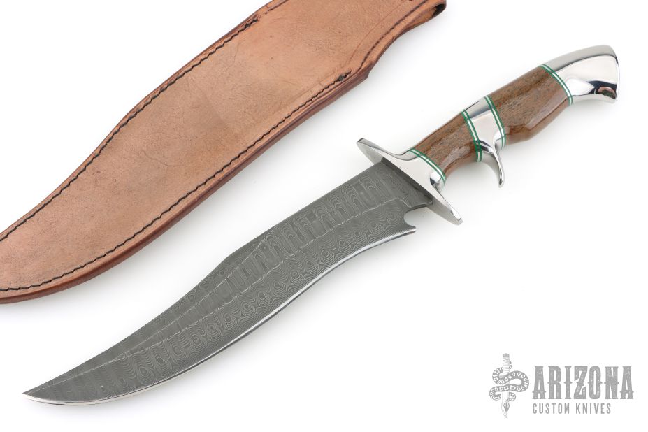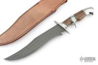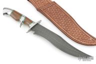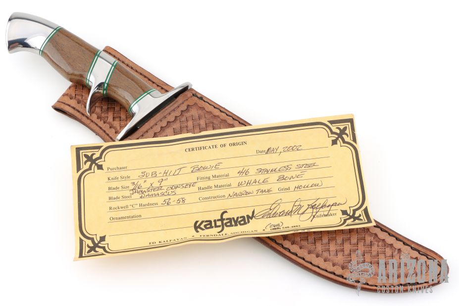 This Sub-Hilt Bowie by Ed Kalfayan features an Odin's Eye pattern Damasteel blade with false top edge, .196" blade stock and 1.815" blade depth, hidden tang construction. The handle is comprised stainless guard, sub-hilt, pommel, and wale bone grip. Comes with COA dated May 2002. Comes with zipper case and leather sheath. Excellent condition.