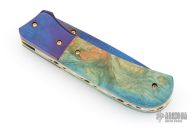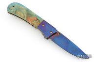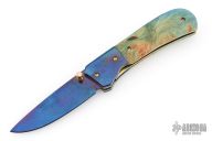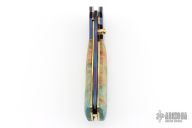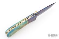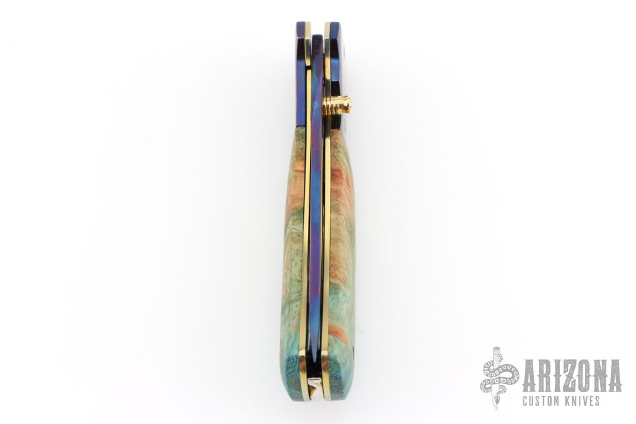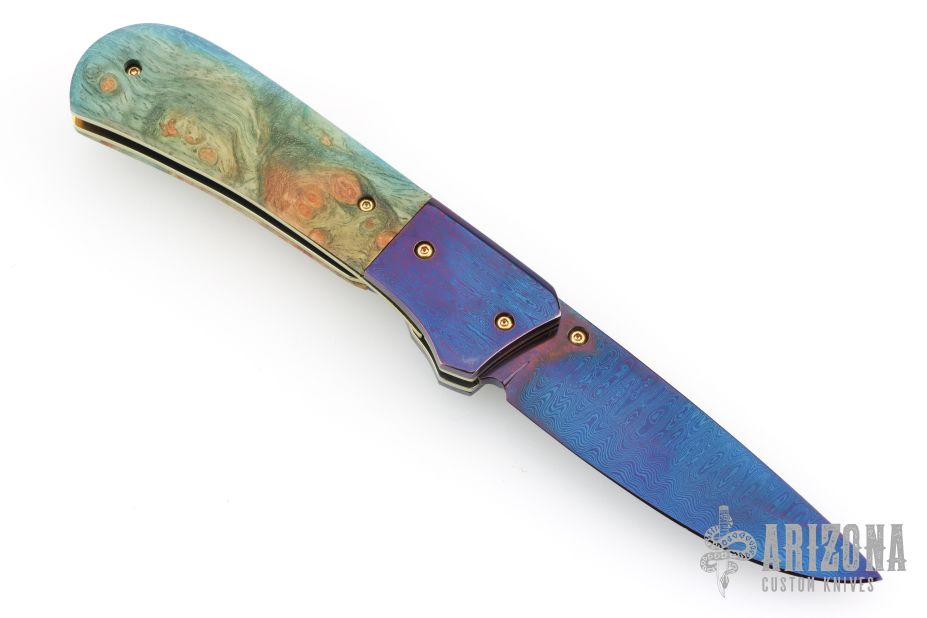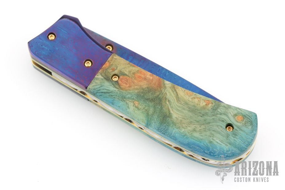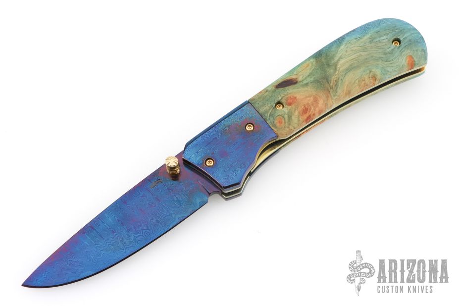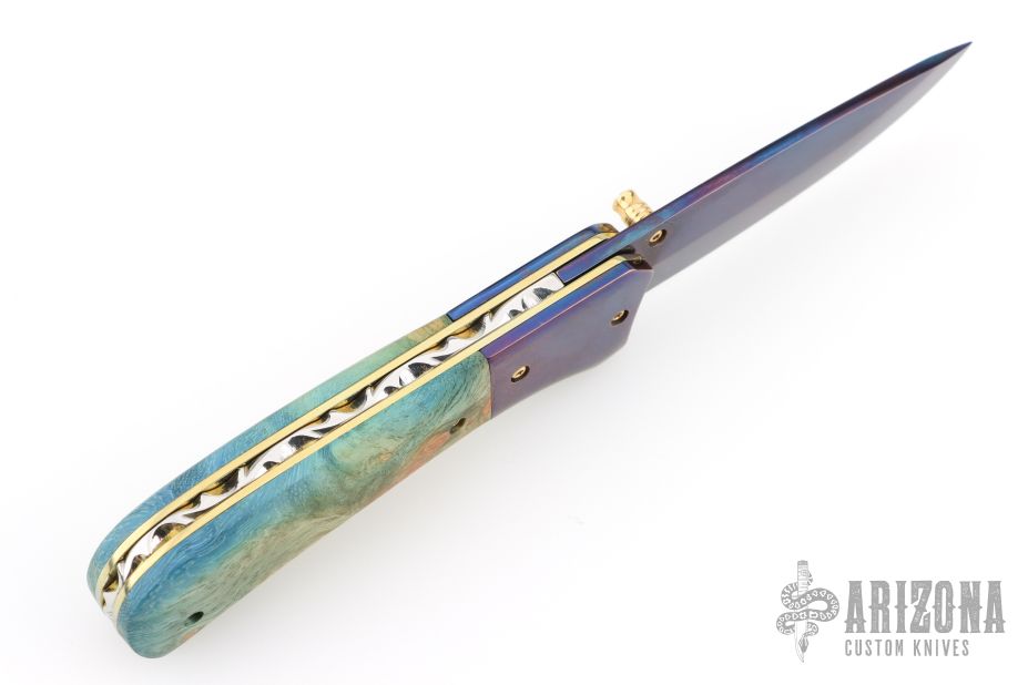 I make folders and balisongs and my preferred handle material is carved or inlayed pearl, but it is very dangerous to work with as it will crack with the slightest error. For this reason, the number of knives I can make is limited to the mistakes I make. Because most of my knives go in collections I use a great deal of mosaic damascus created by Robert Calcinore and Tony Metsala. I believe this steel radiates boldness and brings my knives to life. I also use ATS-34, because it is strong and good for daily use. My personal favorite is Chad Nichols stainless Damascus steel, because it is beautiful and works well for everyday carry knives. Another characteristic of many of my knives is my spring mechanism.