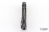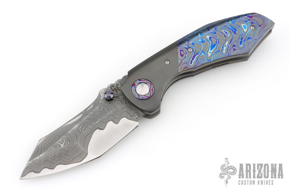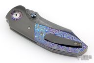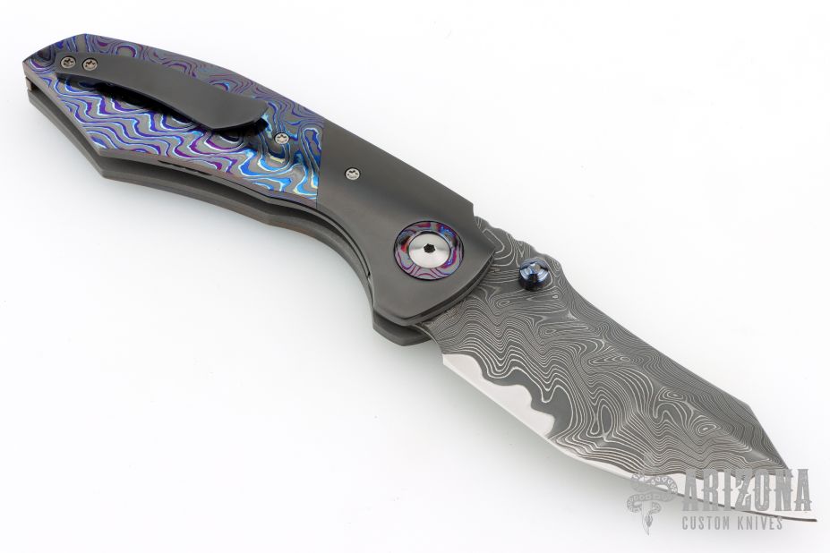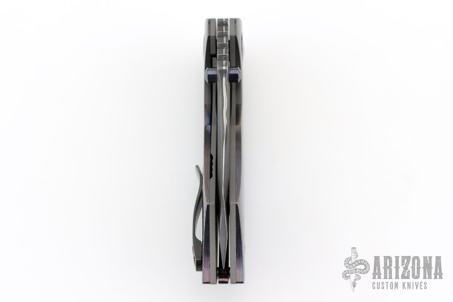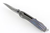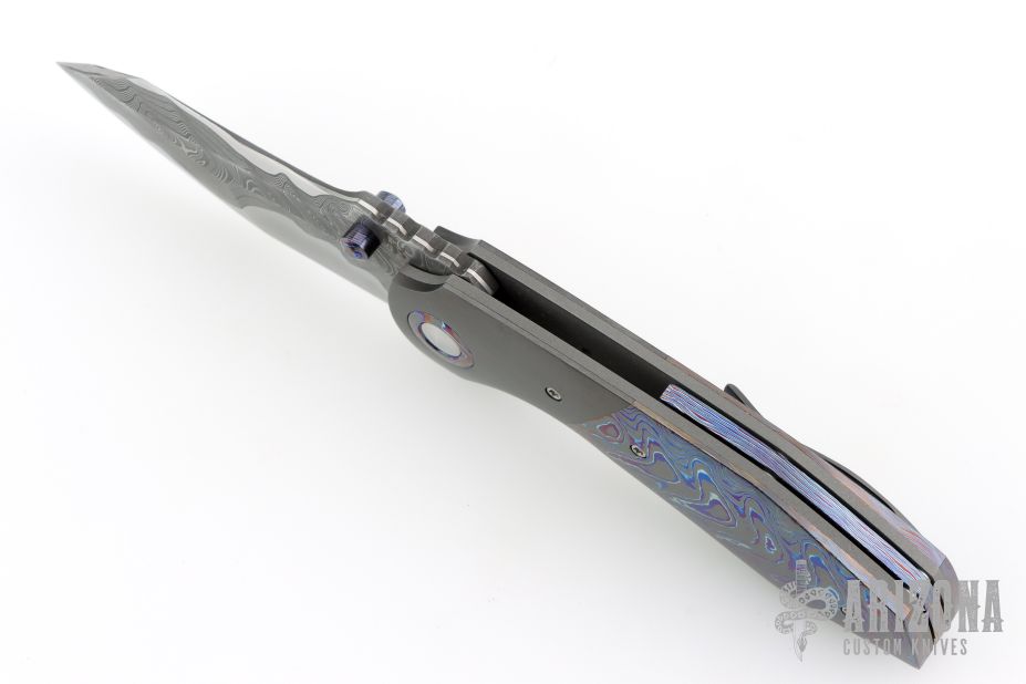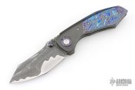 This Full Dress Bangarang by Matthew Christensen features an ArmorCore San Mai Damascus blade and dual ZircuTi thumbstuds. The handle has a zirconium bolsters, ZircuTi scales, ZircuTi pivot collars, bead blasted titanium liners, floating ZircuTi backspacer and a zirconium tip up clip. Nice detent, lockup and blade seating. Comes with cloth pouch, COA dated October 2018. Excellent condition.