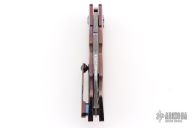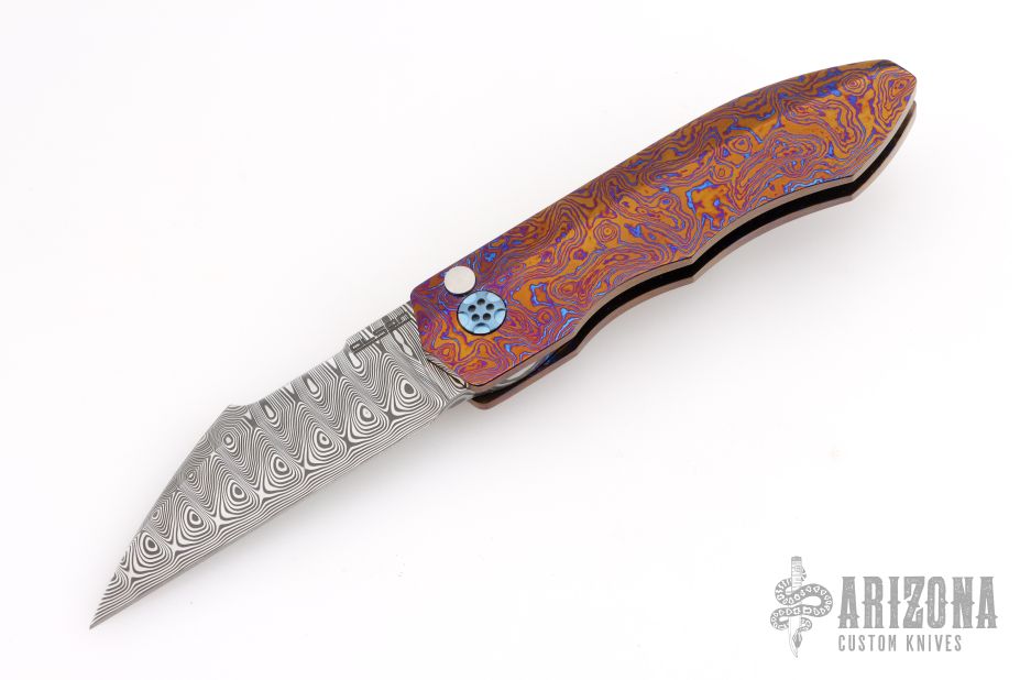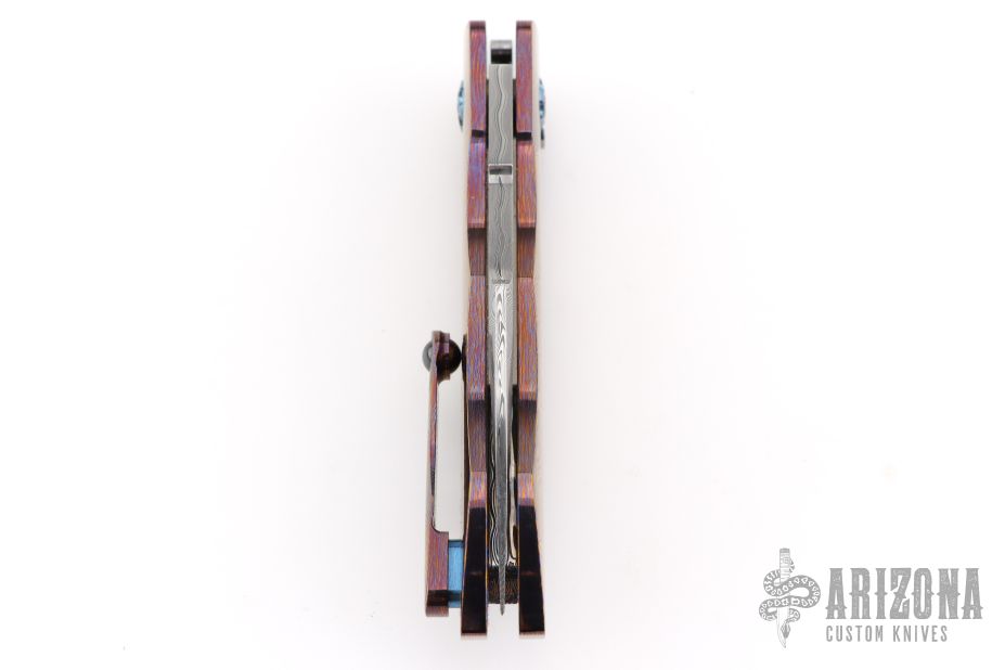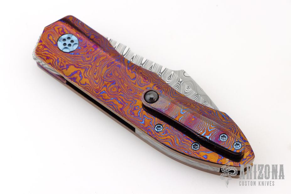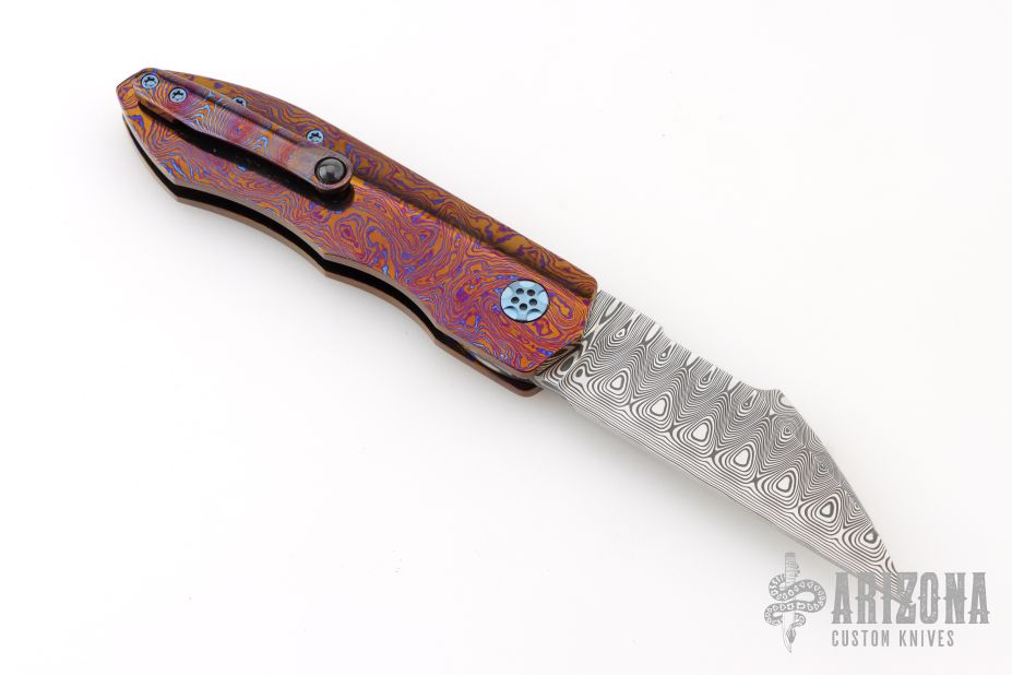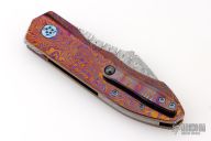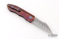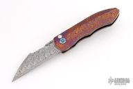 This Full Dress Sunda by Rod Olson features a etched/polished Odin's Eye Damasteel recurve blade with flipper. The handle has a Timascus body, Timascus tip up clip, and matching Damasteel backstrap. Very well done. Rides on bearings, nice detent, lockup and blade seating. Comes in a zipper case. Has a couple light scratches, excellent condition otherwise.