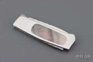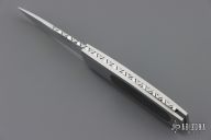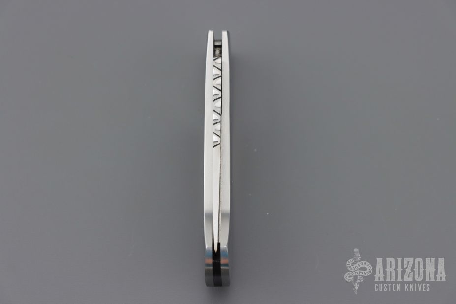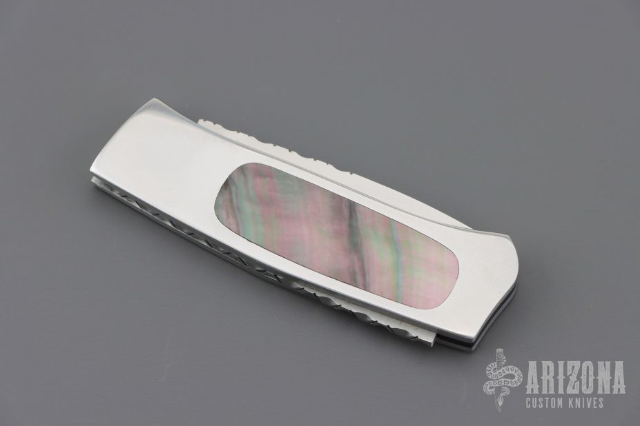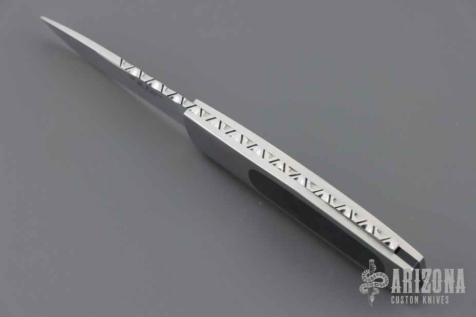 This knife by W.D. Pease features a hand rubbed satin finished blade with nail nick.  The handle has a polished stainless steel frame, black lip pearl inlays, and a fileworked SS backstrap. Comes with a zippered case. Nice lockup and blade seating. Has a few very fine scratches, excellent condition. Blade is marked "28aim8".