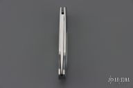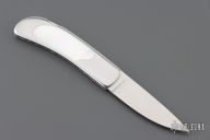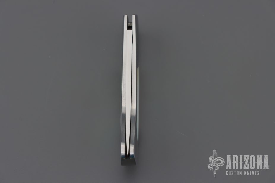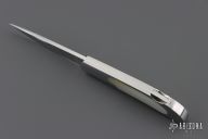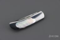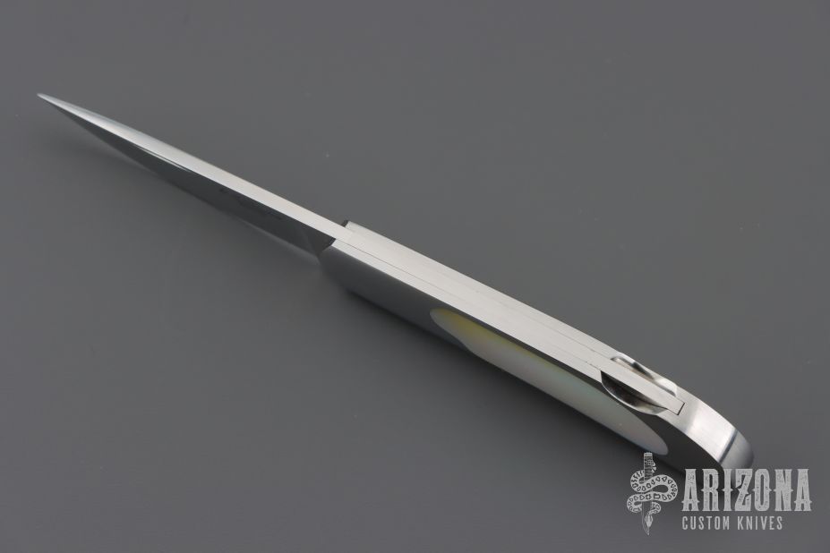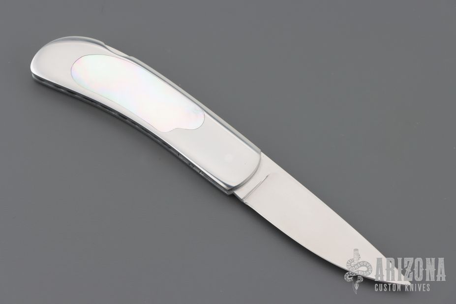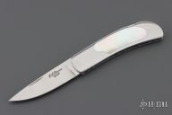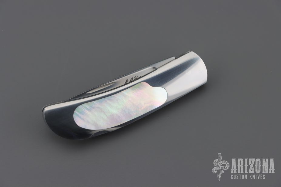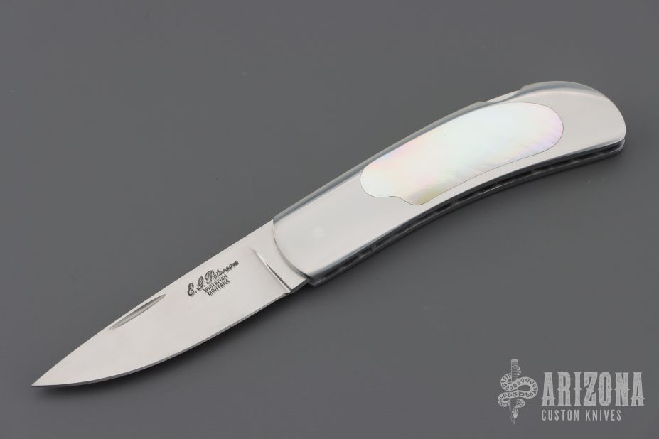 This knife by E.G. Peterson features a hand rubbed satin finished blade with, nail nick.  The handle has a polished stainless steel frame, mother of pearl inlays, and a stainless backstrap. Comes with a zippered case. Nice lockup and blade seating. Has some scratches, excellent condition.