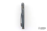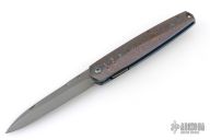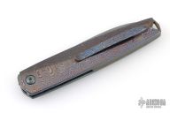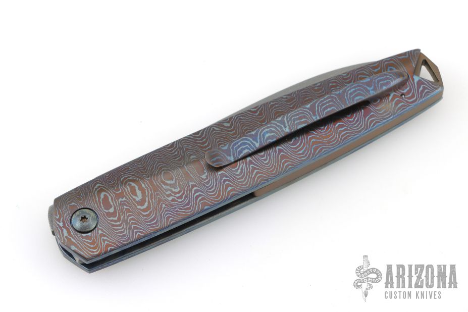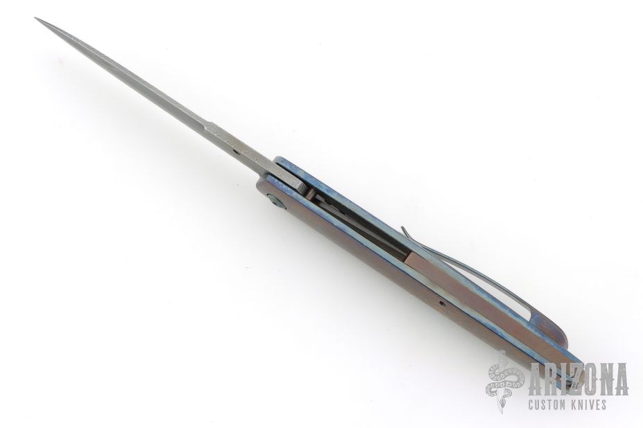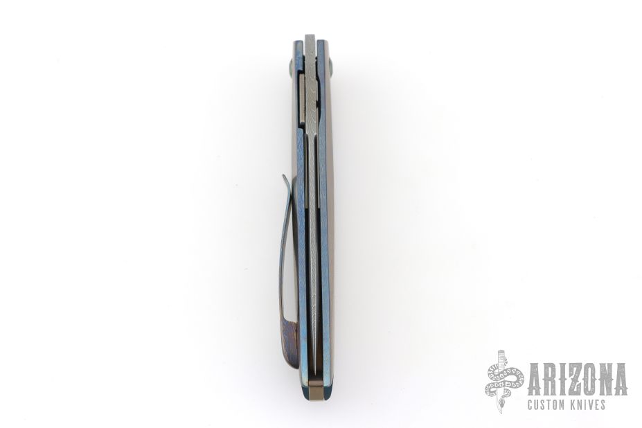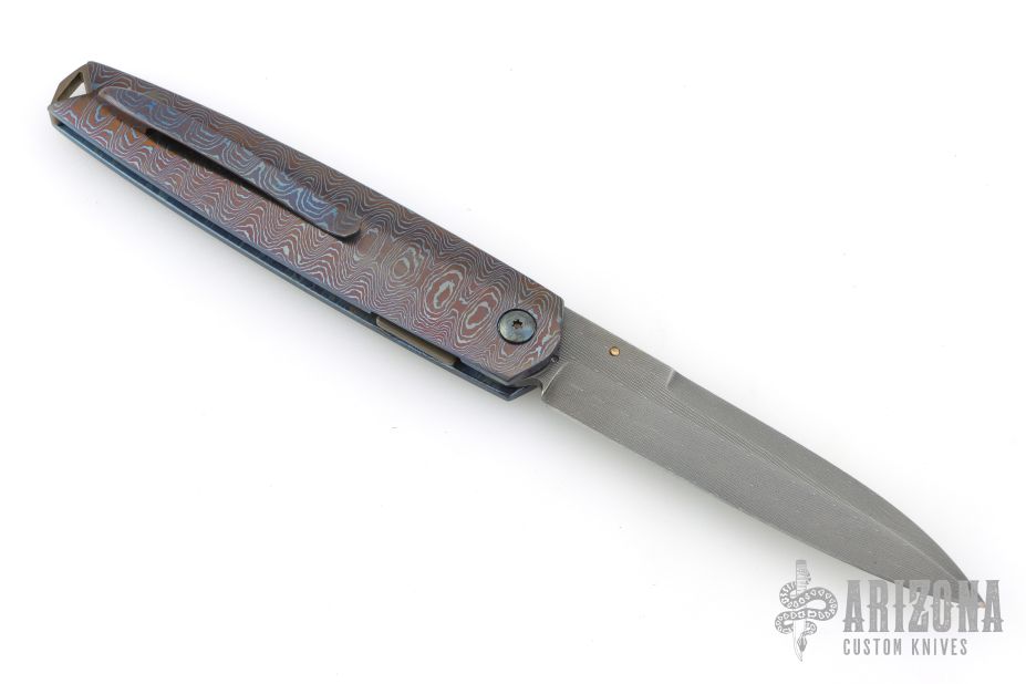 This "Pacific" by Bob Terzuola features a Vegas Forge "Fine Herringbone" Damascus blade with false top edge, nail nick, and a 5-6pt Diamond set in a gold bezel. Each knife from this years TKI show of Bob's has a diamond accent signifying his 75th Birthday. The handle has a full Chad Nichols MokuTi frame, inlaid lockbar with stainless lockface insert, orange peel and anodized titanium backspacer, tip up mokuti clip with hidden screws. Rides on bearings, nice detent, lockup and blade seating. Comes with zippered case. Excellent condition.