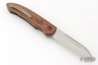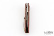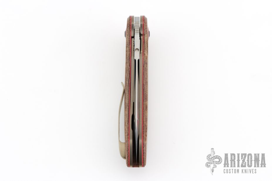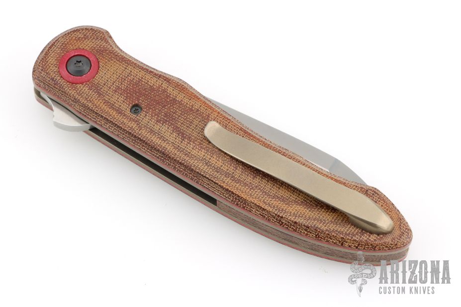This Single Issue Flipper by Bob Terzuola features a tumble finished blade with false top edge, fullers, notched flipper and a 5-6pt Diamond set in a gold bezel. Each knife from this years TKI show of Bob's has a diamond accent signifying his 75th Birthday. The handle has Brazil fine weave canvas micarta scales and backspacer, red liners under the scales, tumbled and anodized titanium liners, red G-10 pivot collars, tip up blasted and anodized titanium clip with hidden screws. Rides on bearings, nice detent, lockup and blade seating. Comes with zippered case. Excellent condition.