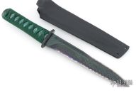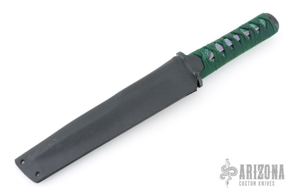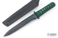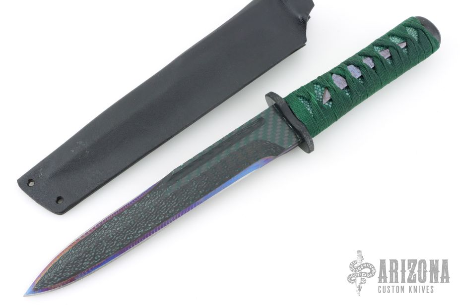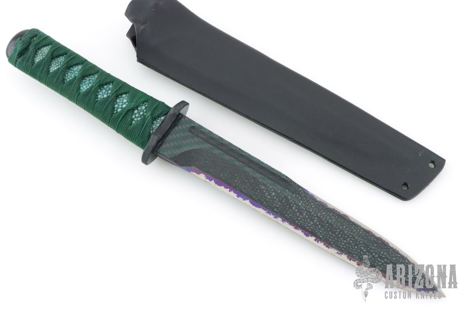 This 2nd Generation Yori by Warren Thomas features a fingerprint anodized titanium blade with a carbidized edge, sharpened top edge, and carbon fiber laminate on both sides with fullers, .369" blade stock overall, .110" thick titanium blade, and 1.381" blade depth. The handle has a carbon fiber tsuba, Japanese style wrap over stingray skin with anodized titanium menuki. Includes kydex sheath. Excellent condition. One of a kind!