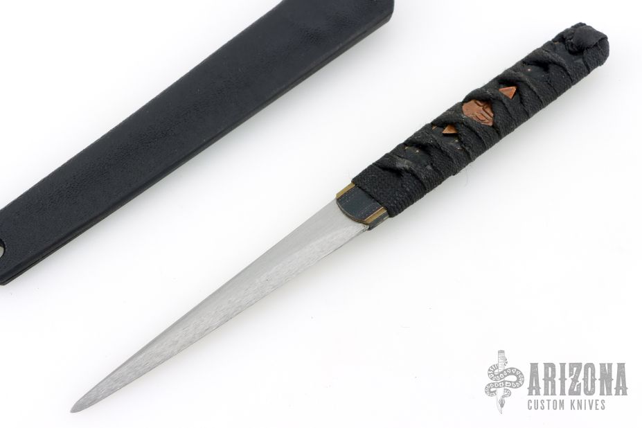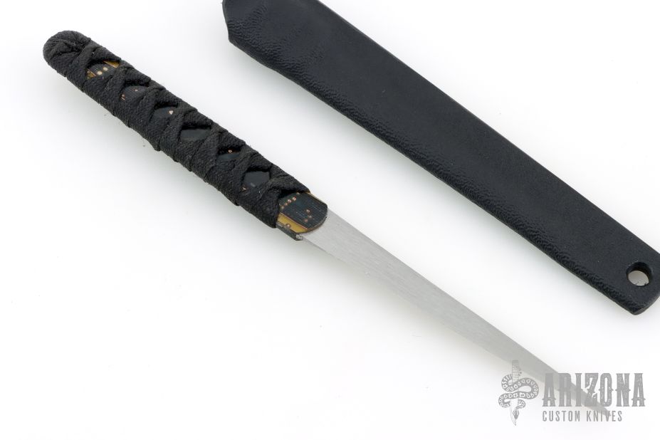 This dagger by Warren Thomas features a satin finished chisel ground blade with a false top edge, .082" blade stock and .560" blade depth. The handle has a Japanese style wrap over circuit board scales with a copper menuki. Includes kydex sheath. Excellent condition.