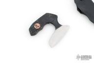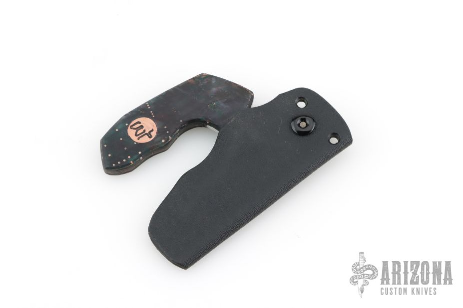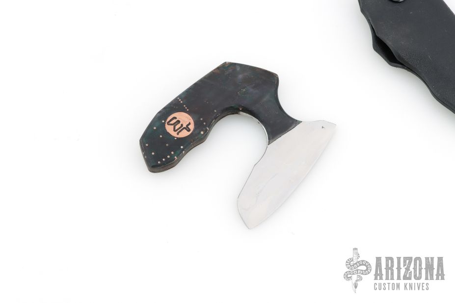 This Punch Knife by Warren Thomas features a satin finished blade with .111" blade stock and 2.595" blade depth. The handle has circuit board scales with a copper WT medallion inlay. Includes kydex sheath. Has a few light scratches, otherwise excellent condition.