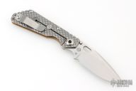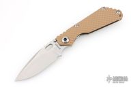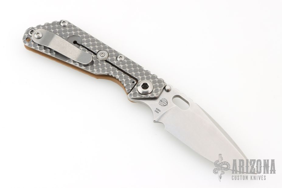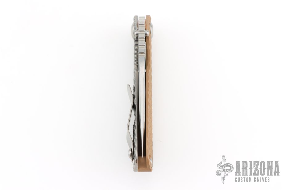 This SNG DGG by Strider has a stonewashed finished blade with dual thumb studs, thumb hole, and notched thumb rest. Handle is Coyote G-10 and bead blast titanium "Gunner Grip", lockbar stabilizer, and titanium tip up clip. Nice detent, lockup and blade seating. Excellent condition.