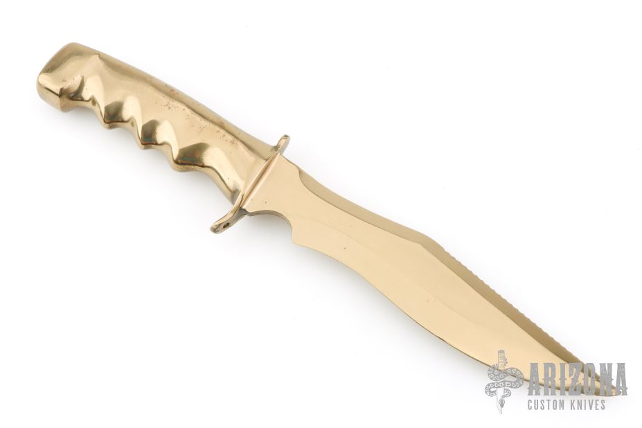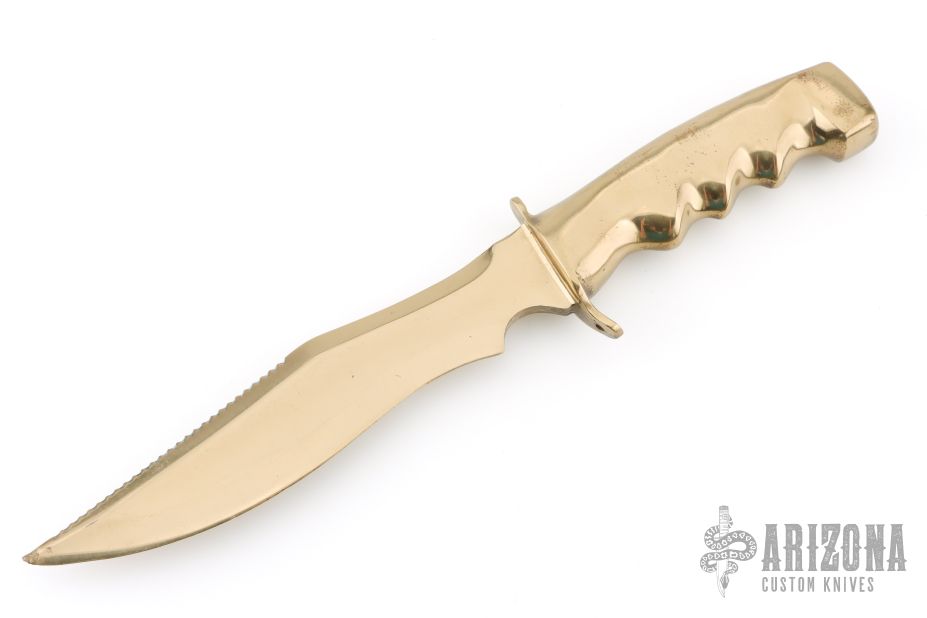 This knife is completely integral and made of cast silicon bronze, .234" bladestock, 1.507" blade depth, integral construction. Has some light scratches, otherwise excellent condition for its age. Comes with a zippered case.