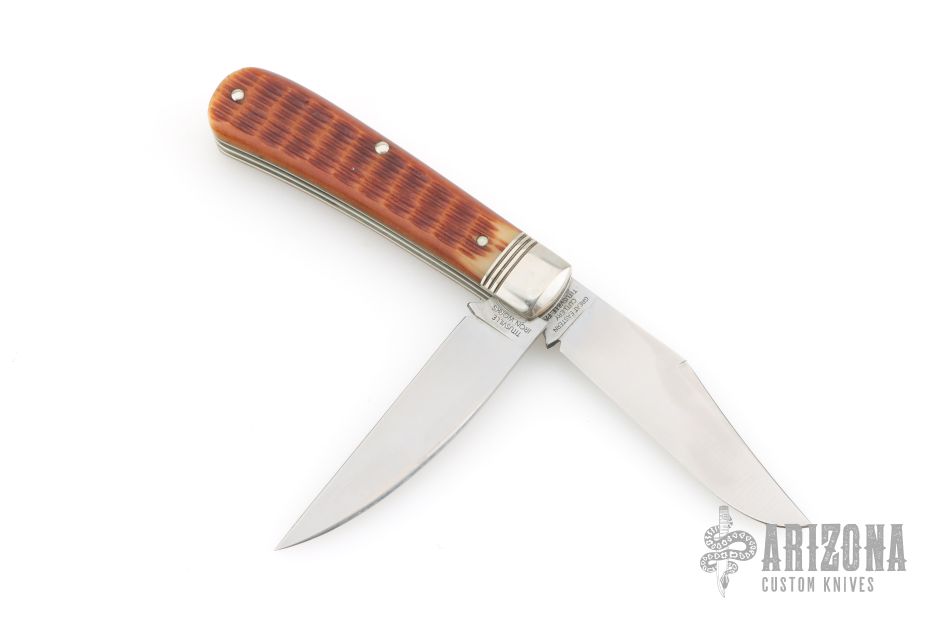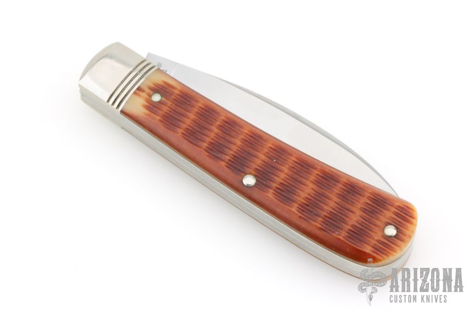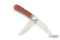 This slipjoint from Great Eastern Cutlery features two satin finished blades with nail nicks. The handle has nickel silver bolsters, jigged bone covers with silver liners, and steel springs. Includes original tube and wax paper. Excellent condition.