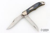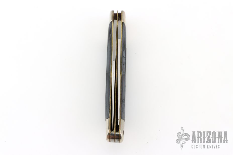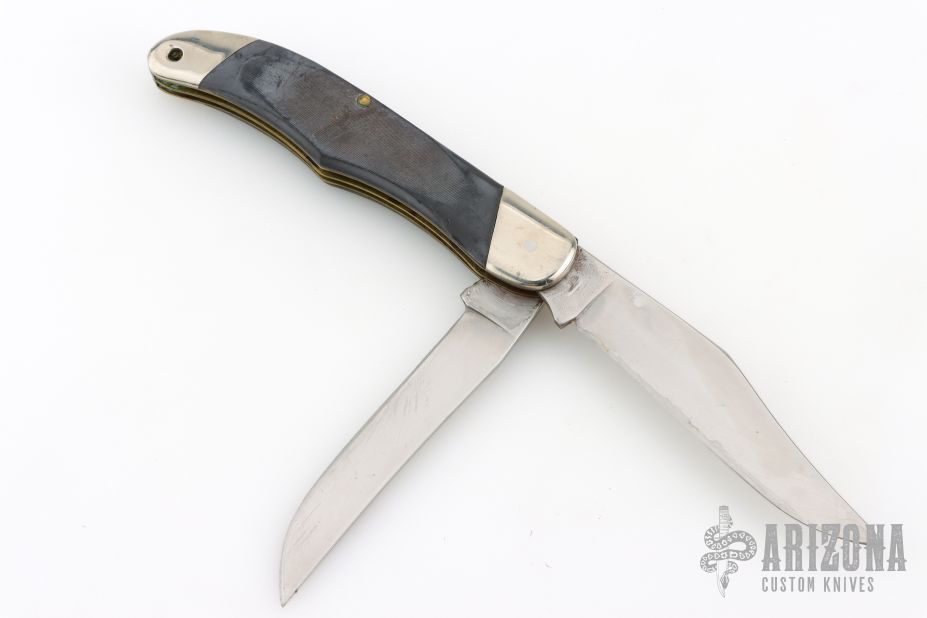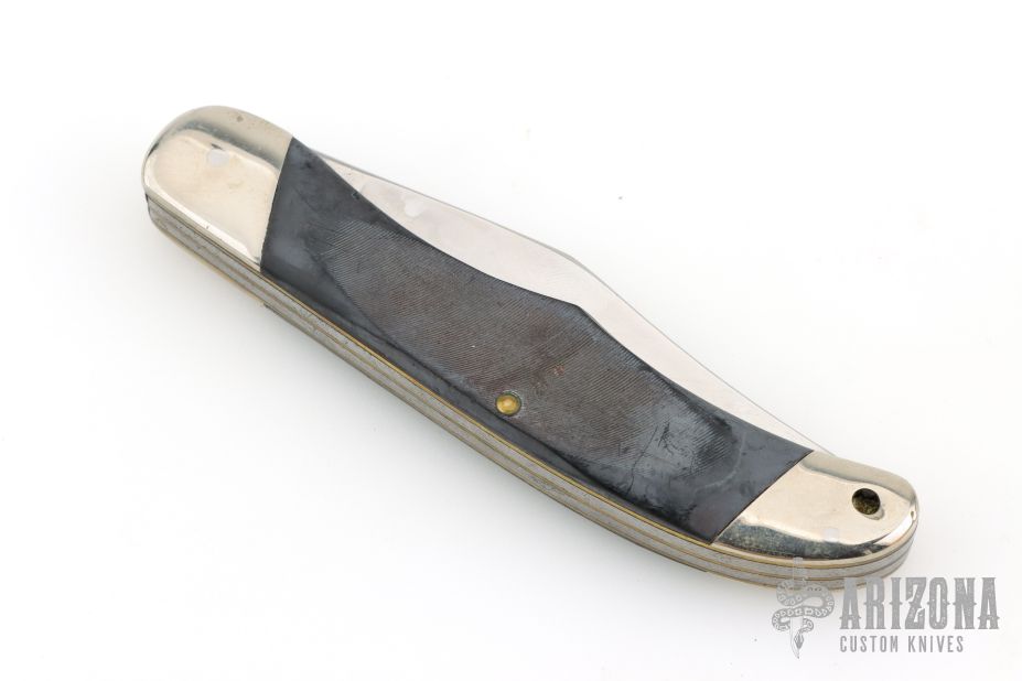 This Buck 317 features two satin finished blades with nail nicks. The handle has nickel silver bolsters and butt, brass liners black sawcut covers with nickel silver escutcheon, steel springs. Has scratches, has been used and sharpened, has scuffs, good user condition.