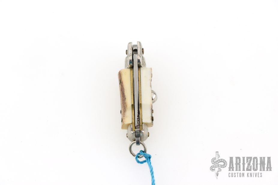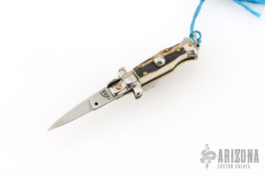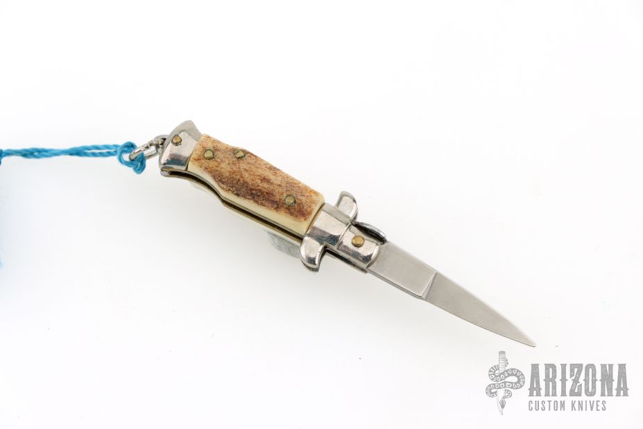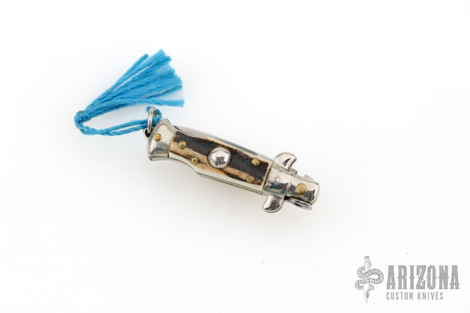 Mini Stiletto Auto Keychain. Has stag scales, nickel silver bolsters, brass liners. Excellent condition.