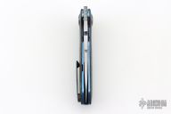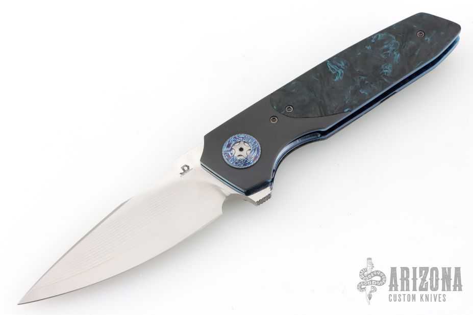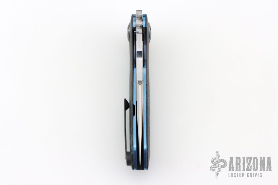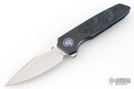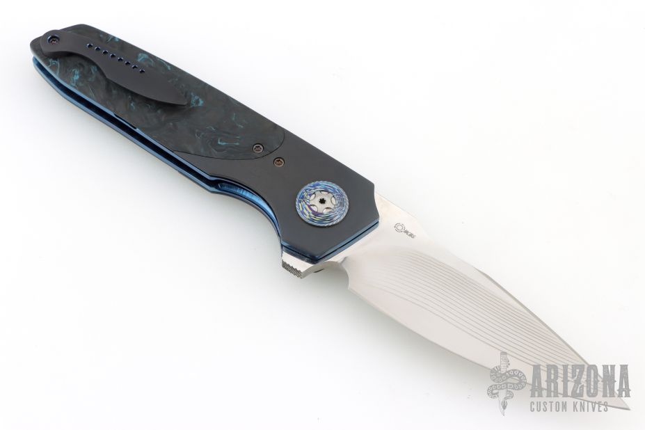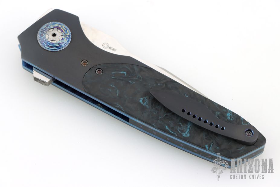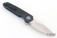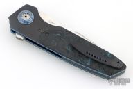 This Linerlock Flipper by JD VanDeventer features a Takefu blade with satin flats and notched flipper. The handle has titanium bolsters, Timascus collars, gear pattern pivot, Fat Carbon covers, Fat Carbon backstrap with titanium pin inlays, anodized titanium liners, tip up anodized clip. Comes with a zipper case and COA dated 2023/05/29. Has a couple light scuffs, excellent condition otherwise.