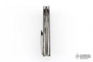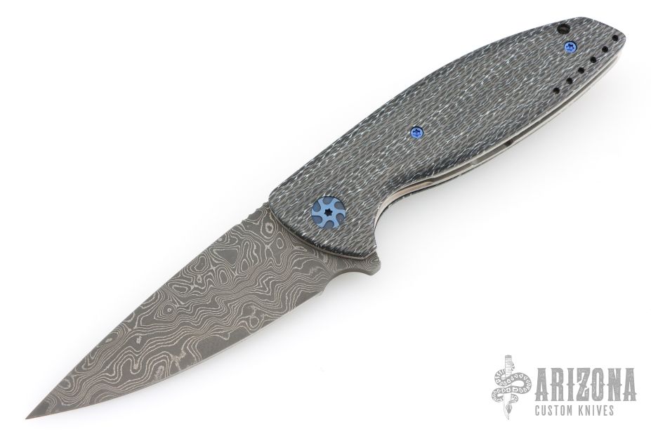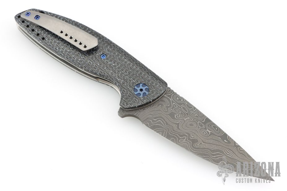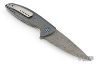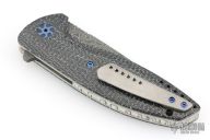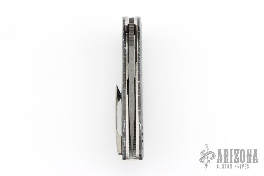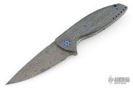 This VLD by Peter Carey features a Mike Norris Random Damascus blade with notched thumbrest and flipper. The handle has White Zebra Turbo Carbon scales, textured titanium liners, black/white CarboQuartz dragonspine backspacer, tip up tumbled titanium clip, lanyard hole at the butt, anodized titanium hardware. Comes with black/white CarboQuartz bead and a Velcro case. Rides on bearings. Nice detent, lockup and blade seating. Comes with COA dated 9-13-18. Excellent condition.