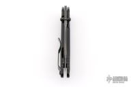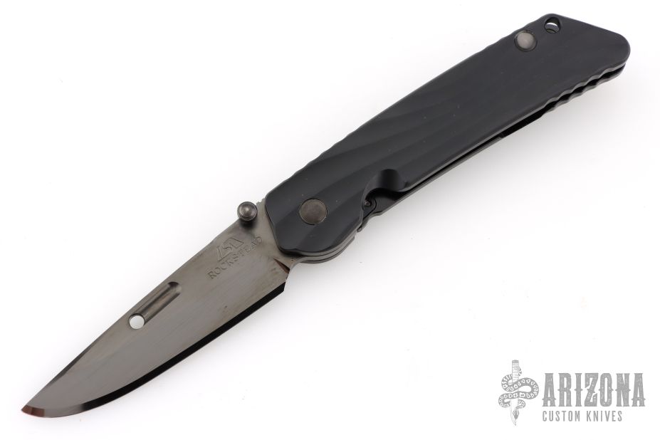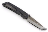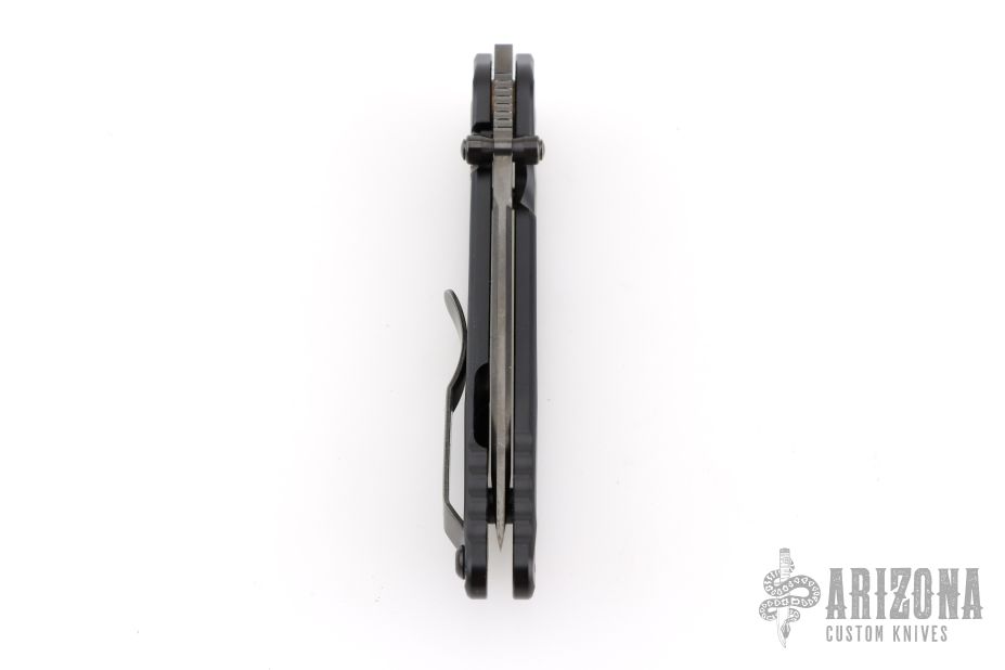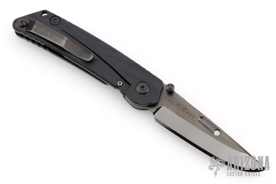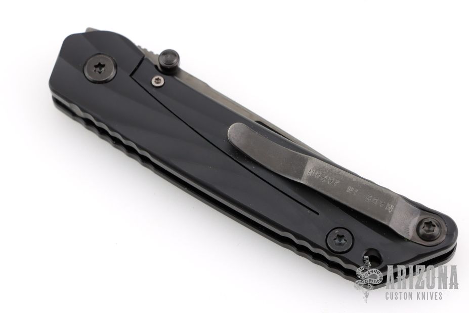 "The blade is convex on both sides in the tradition of the highly praised Japanese sword. This shape is both sharp and strong, and can still slice paper even after the 1,000 of hemp rope cuts. Using this blade form is one superb method of making an edge thick without losing of its sharpness. This is a knife of preeminent sharpness. You can enjoy its strong cutting capabilities for a long time. Even if used for rigorous cutting, the blade will not bite thanks to its convex shape. Other knives often will bite, and may nick if it is pulled out suddenly at that time. This knife scratches the plate of china. Please do not use it to cut food on the plate." The handle is sculpted black aluminum and tip up black stainless steel clip. Comes with original box, cloth, tool, extra pivot, and papers. #489 on blade. Has some scuffs on the clip, otherwise Excellent condition.