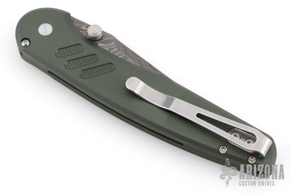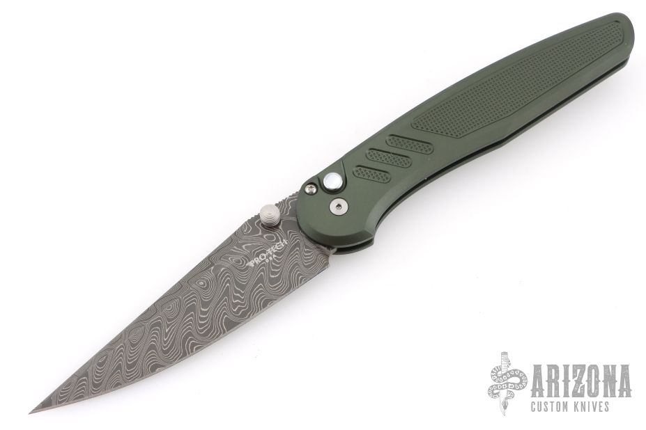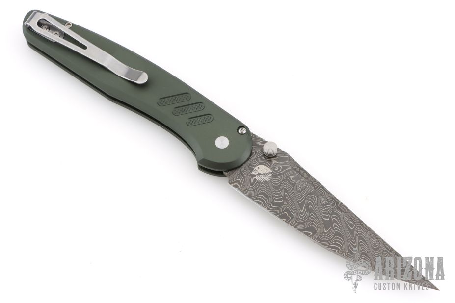 The Pro-Tech Avalon, designed by Peace Neighbor, is a full-size button lock folder built for clean performance and everyday reliability. Made in the USA, it features a 4.25" drop point blade crafted from Chad Nichols Boomerang Damascus, paired with knurled green aluminum handles for a secure, confident grip. Smooth thumb stud deployment and a consistent button lock provide reliable action and lockup, while its balanced ergonomics allow it to carry lighter than its size suggests without sacrificing a solid in-hand feel. Tip-up, right-hand carry. Includes the original box.  New from maker!
