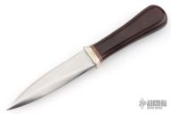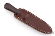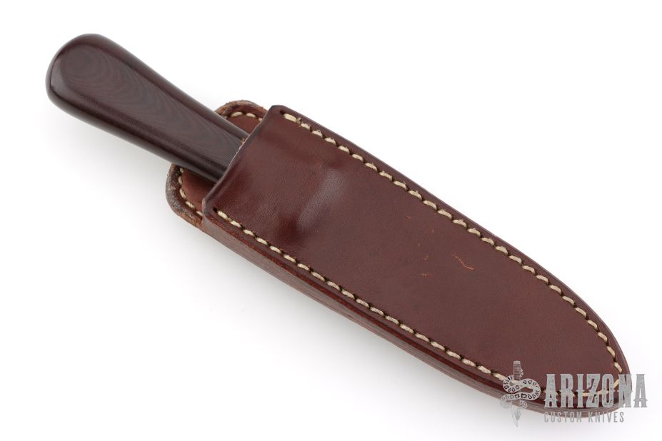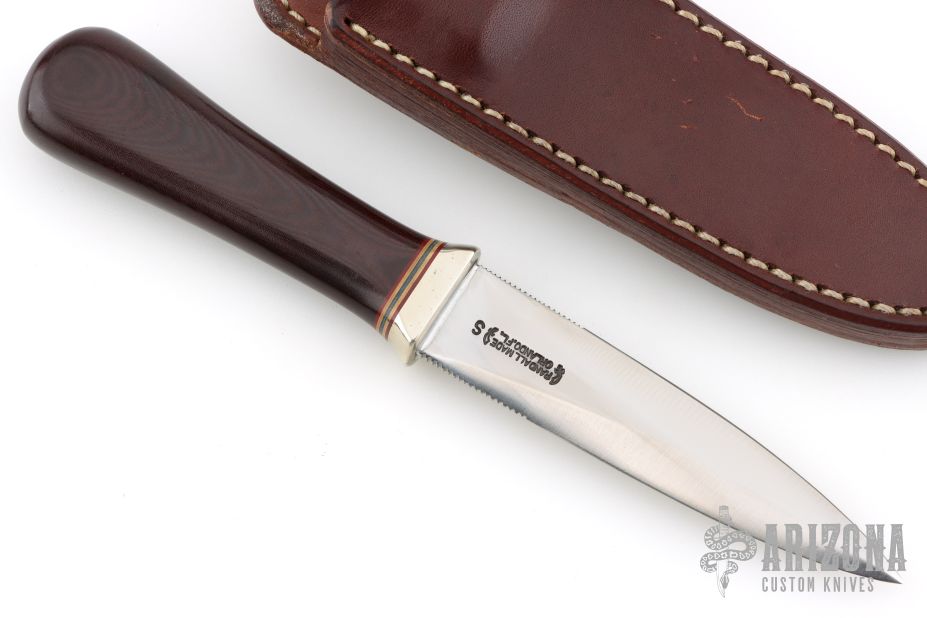 This Model 24 Guardian by Randall Made Knives features a satin finished double-edged blade with notched finger rests, .179" blade stock and .832" blade depth, hidden tang construction. Maroon linen micarta grip with red/white/blue spacers and a nickel silver guard. Both edges of the blade are sharpened with 1" of thumb notches. This model was designed in 1978 for use by police, undercover agents and law enforcement personnel for self-protection and as a back-up weapon. Comes with a brown leather sheath w/ boot clip. Excellent condition.