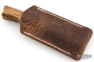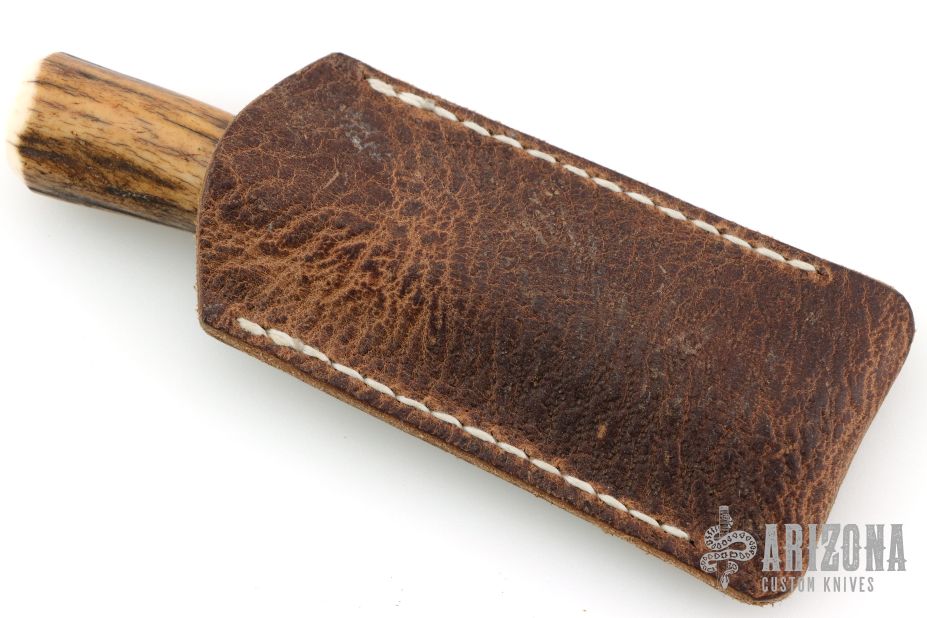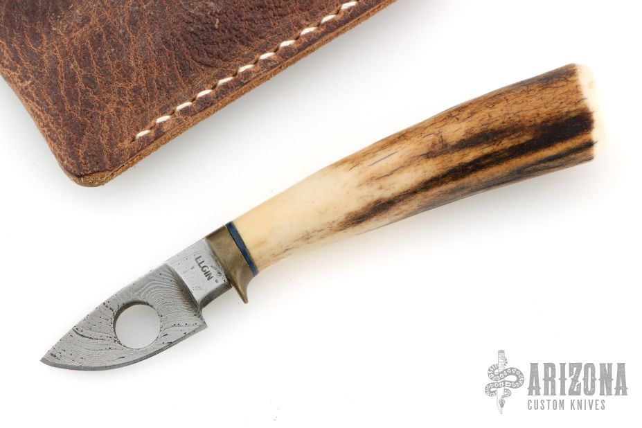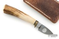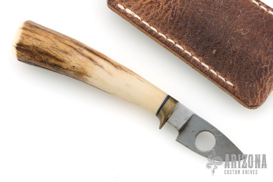 This small skinner from Kelgin Knives features a drop point Damascus blade, .212" blade stock and .645" blade depth, hidden tang construction. The handle is comprised of a brass guard and stag grip with a black spacer. Includes leather slip sheath. Excellent condition.