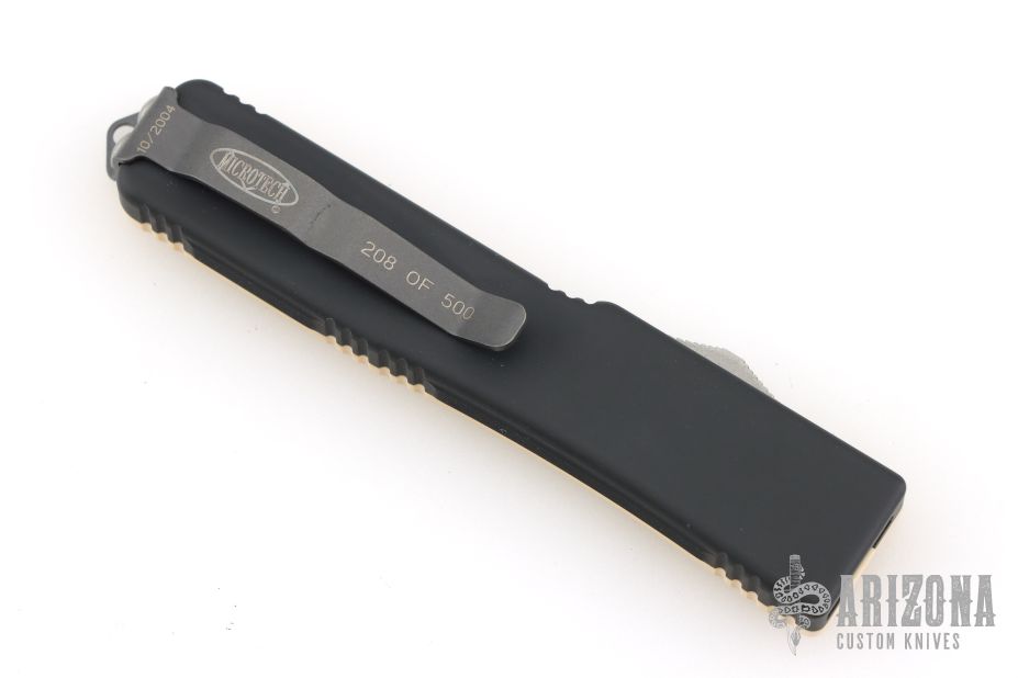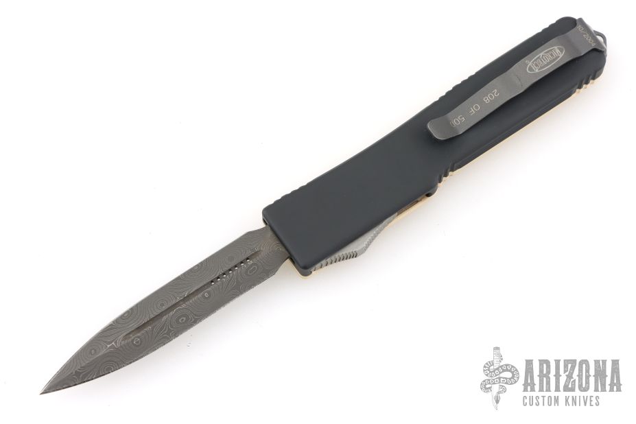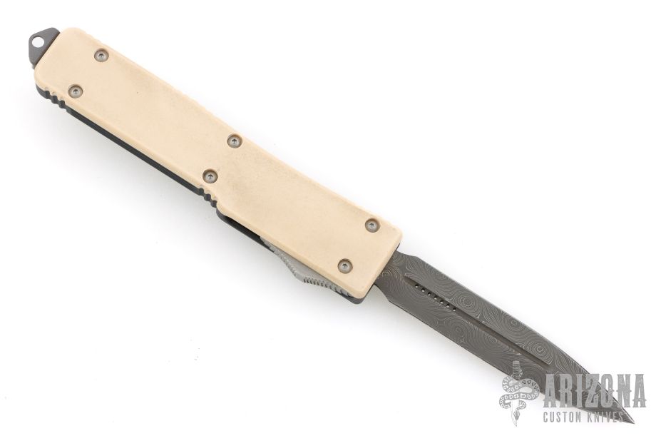 This UTX-70 by Microtech has a double edge Damascus blade. The handle has a black aluminum frame with white linen micarta top. Black coated stainless steel clip. Dated 10/2004. Numbered 208 of 500. Includes original box, sheath, and paperwork. Excellent condition.