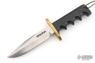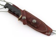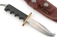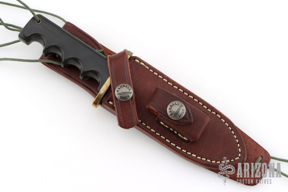 This is a miniature version of Randall's Model 14 Attack. The Model 14 was designed to meet the demand for an almost indestructible all-purpose knife, though it is especially suited for combat and survival purposes. #889. Satin finished blade with sharpened top edge, .176" blade stock and .829" blade depth, full tang construction. The handle has a brass guard and black linen micarta grip, lanyard hole at the butt. Comes with original brown leather sheath and original paper wrapping. Excellent Condition.
