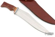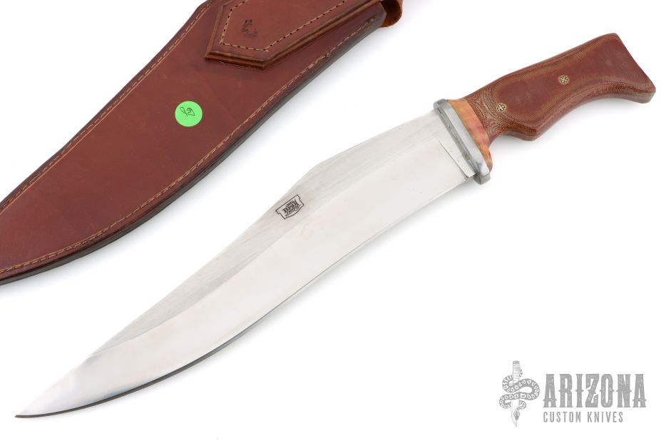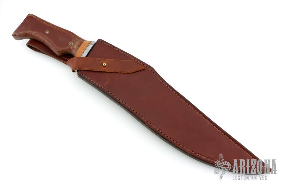This Long Reach Bowie by Lowell Bray features a satin finished blade, .290" blade stock and 2.644" blade depth, hidden tang construction. The handle has a stainless steel guard, brown canvas micarta grip with a curly maple spacer, mosaic pins. Comes with a brown leather sheath. New from maker.
